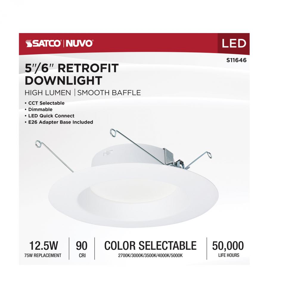 12.5 Watt LED High Lumen Downlight Retrofit; 5-6 Inch; 27K/30K/35K/40K/50K CCT Selectable; 120 Volts; Dimmable; White Finish