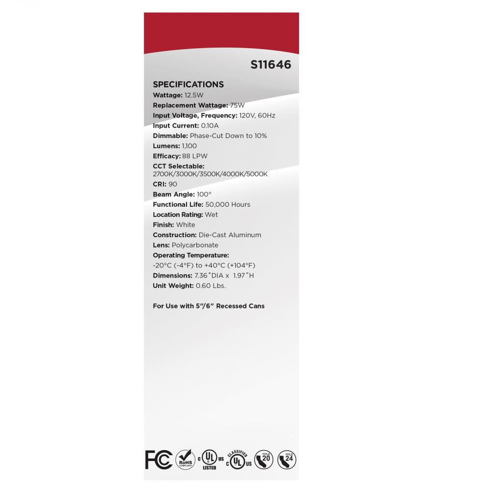 SATCO NUVO's LED CCT Selectable 5-6 inch High Lumen Retrofit Downlight, S11646, will elevate the lighting in any space. Designed with impeccable 90 CRI color rendering, you can make your space brighter while saving energy with this 1,100 high lumen LED