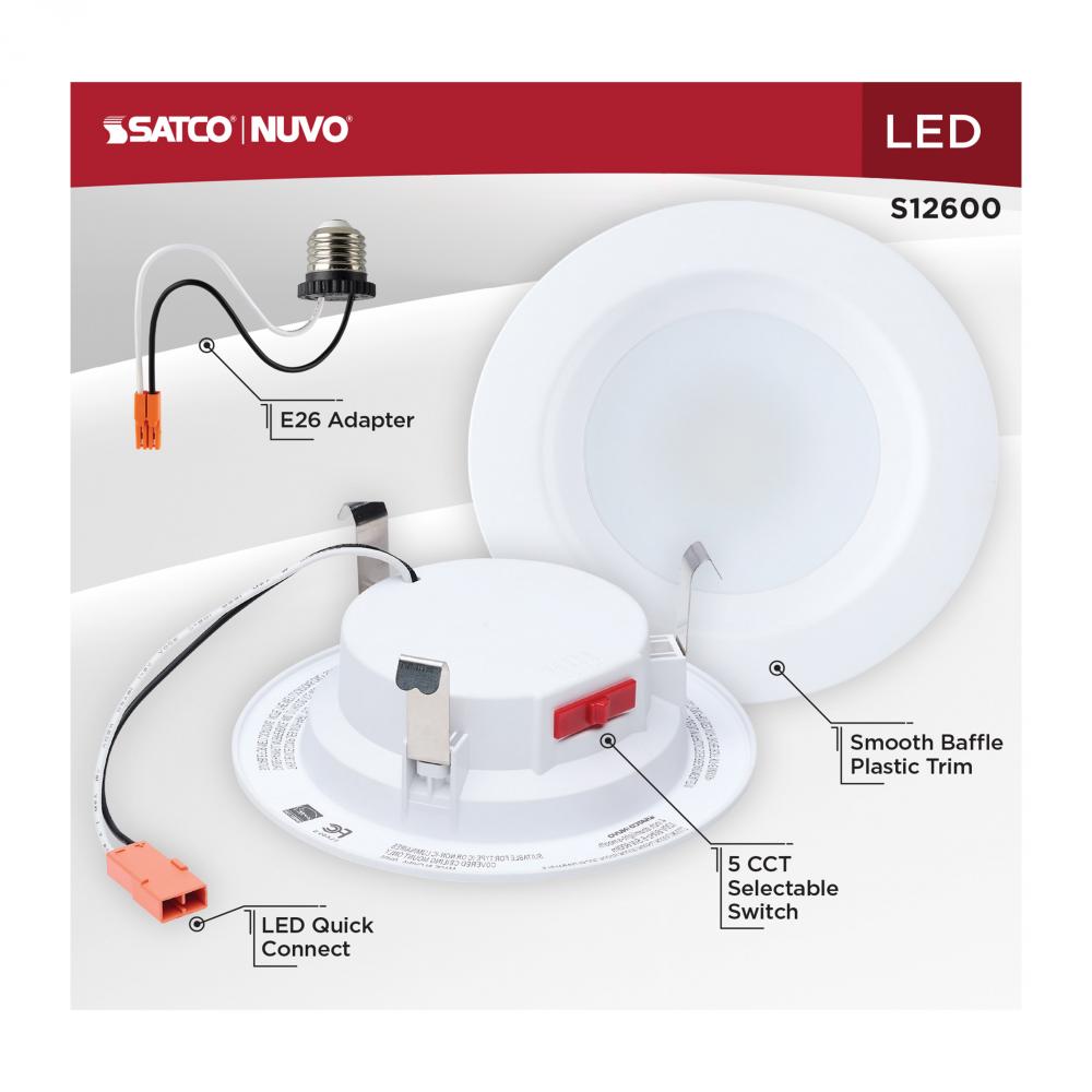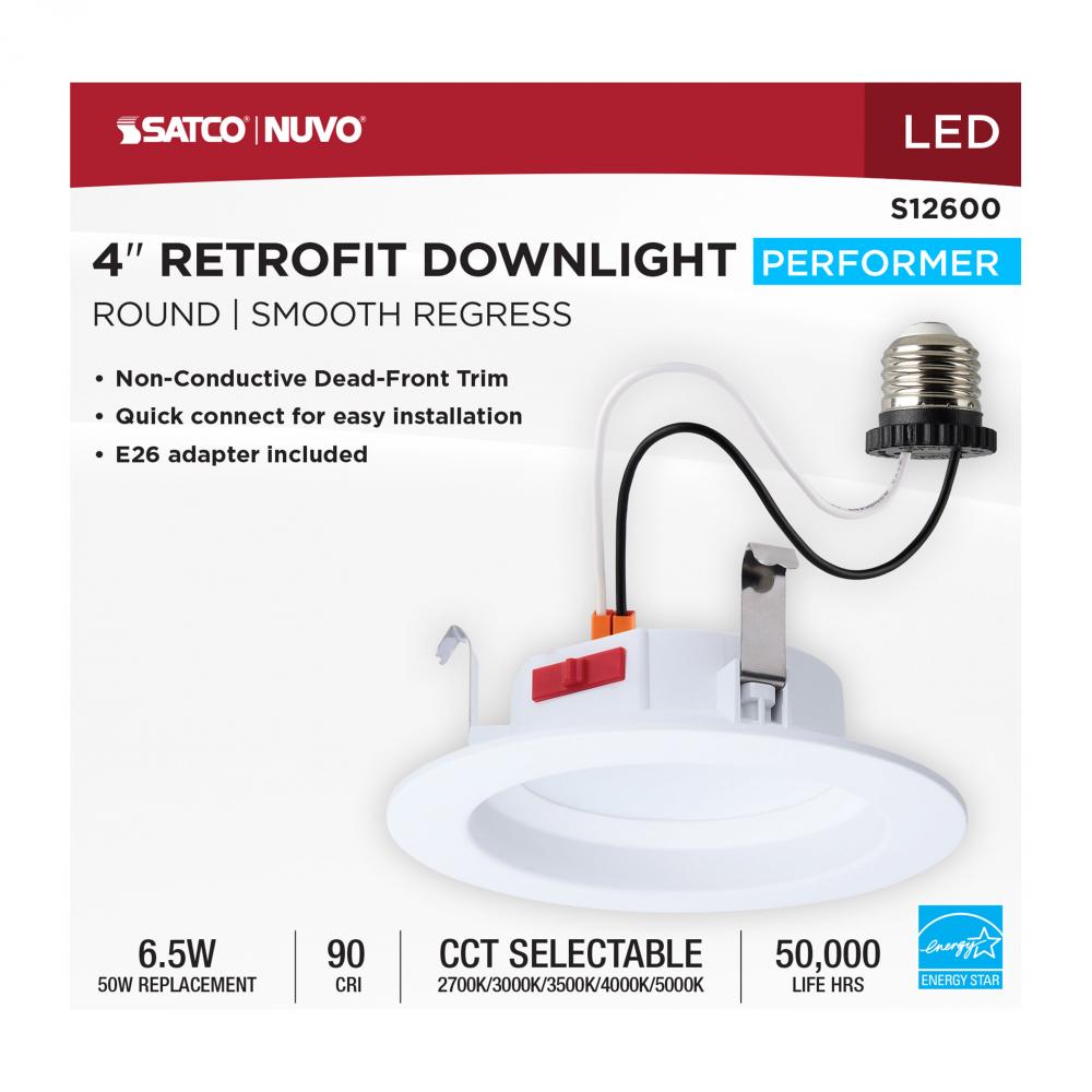 SATCO NUVO's S12600 4-inch round Performer Series LED Retrofit Downlight combines effortless installation with a sleek, functional design. Its smooth regress baffle minimizes glare, while the integrated on-unit switch allows easy selection from 5 color