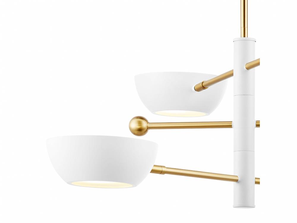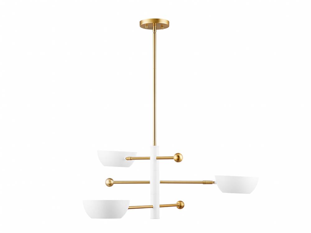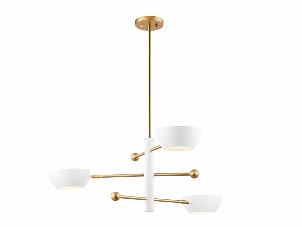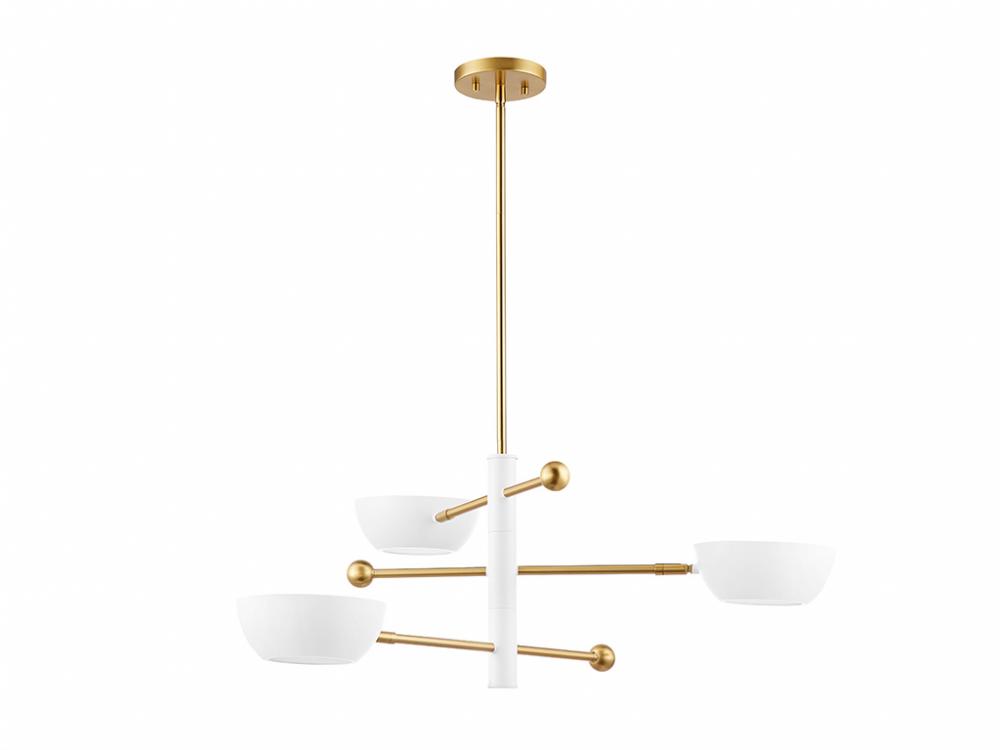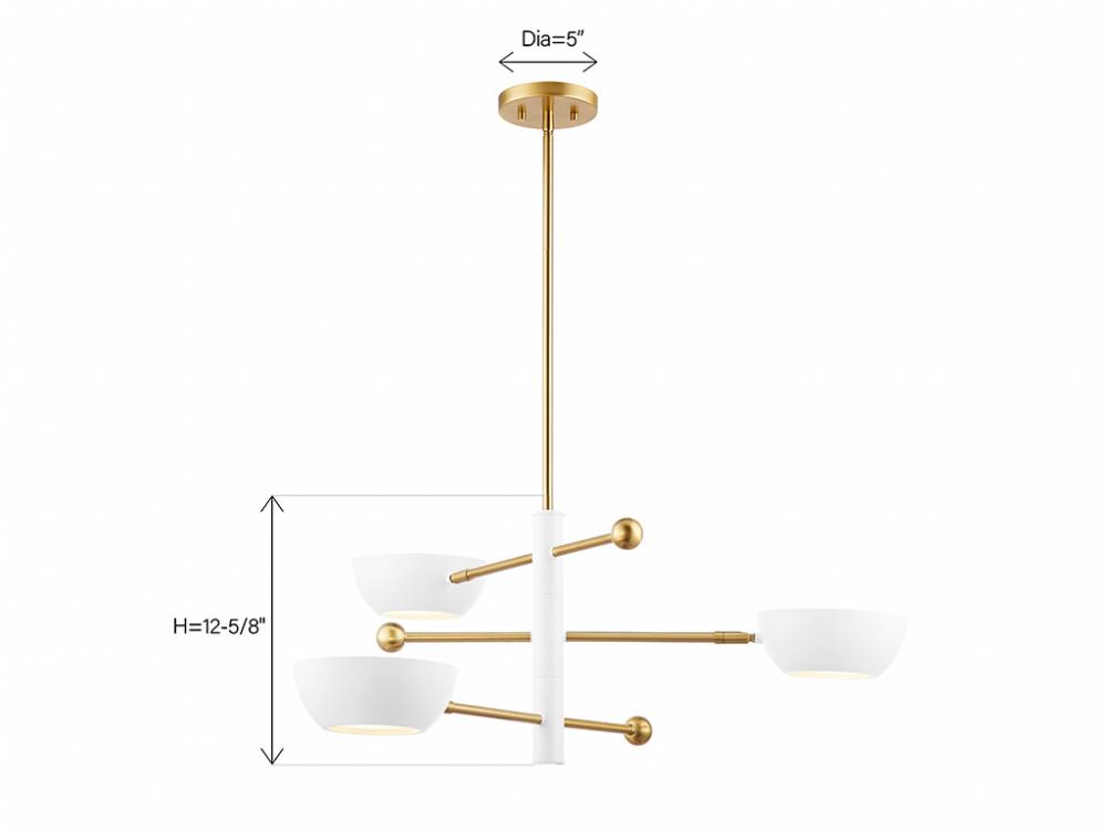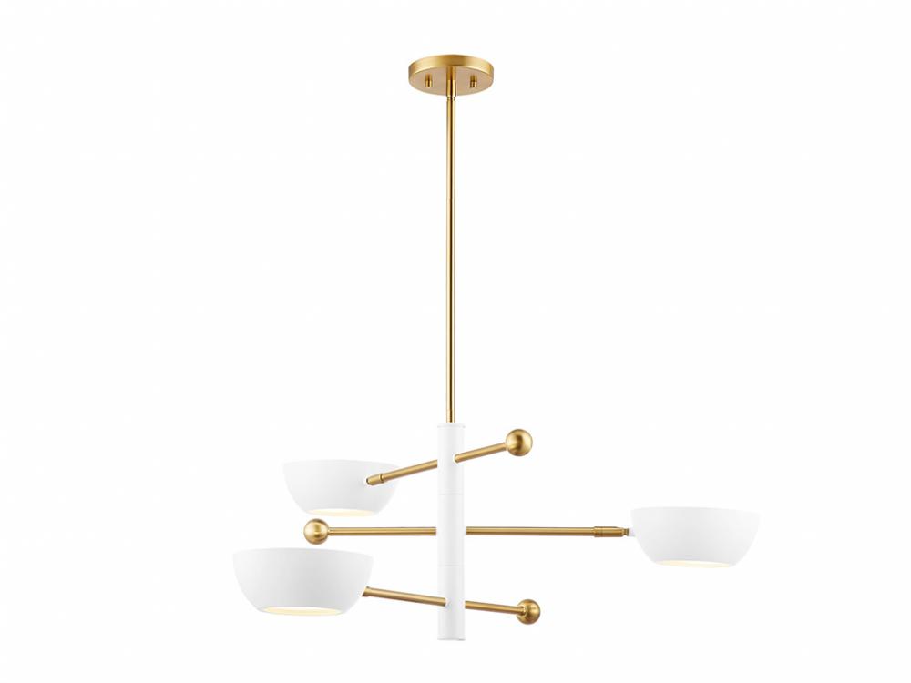 Bring this inventive 3-light pendant into your home and watch it become a conversation starter! The three lights are stacked atop one another on adjustable arms, allowing you to create a unique lighting look. Light shines above and below the White finished cups and the arms are finished in Natural Brass for two-tone appeal. It is 12" in height and 33.75" in width. Uses three candelabra size bulbs of up to 60 watts per bulb. Bulbs not included.