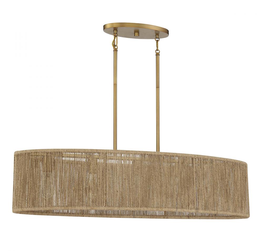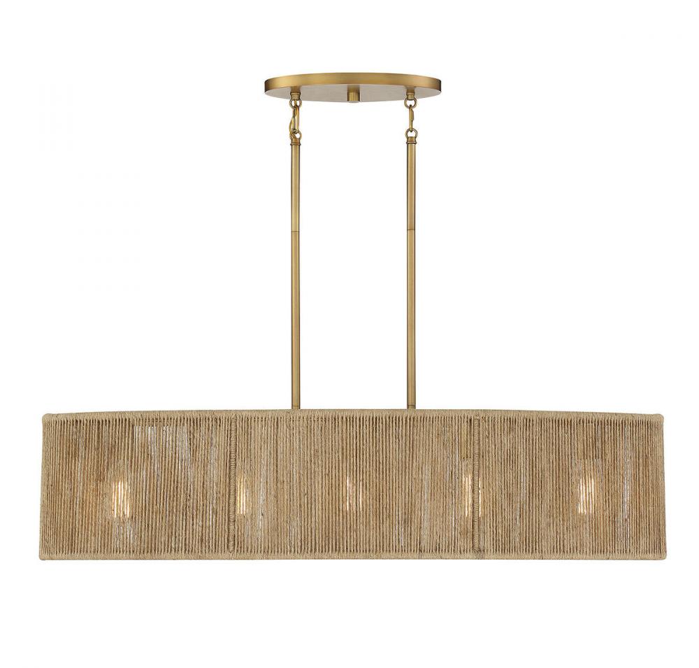 This Savoy House Ashe 5-light linear chandelier has a warm, organic design. Its oblong shade is strung with rows of textured rope, allowing light to shine through and providing a stylish look even when the lights are off. Finished in warm brass. Ashe is 42" in length, 14" in width and has an adjustable height ranging from 15" to 61". It uses five standard size bulbs with a max of 60 watts per bulb. Comes with eight 12" downrods and two 6" downrods, plus 80" of cord.