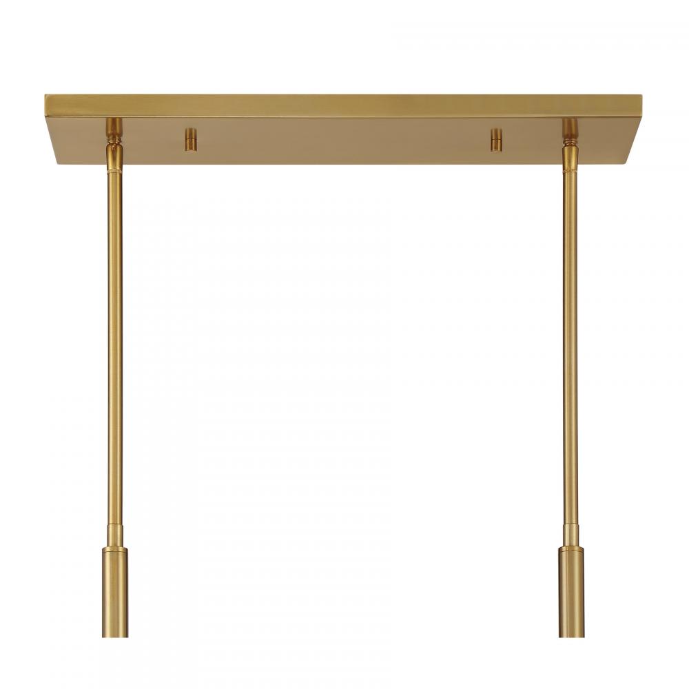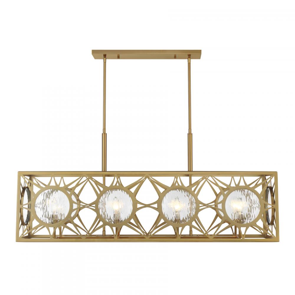 Let your sense of style shine through with the beautiful Balfour 8-light linear chandelier from Savoy House! Its rectangular structure wears a Warm Brass finish and is decorated with eye-catching starburst patterns that hold circular panes of clear water glass. Balfour is 44" in length, 12.88" in width and has an adjustable height ranging from 19.75" to 73.75". It uses eight candelabra size bulbs of up to 60 watts per bulb. Bulbs not included. Comes with eight 12" downrods and two 6" downrods.