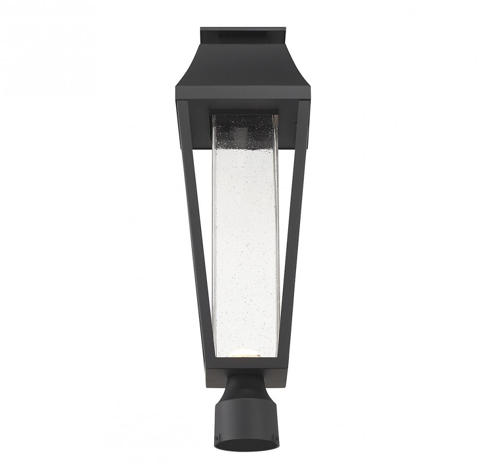 From Savoy House, the Brookline 1-light outdoor post light showcases a more contemporary take on classic lantern-style illumination with a central column of clear seeded glass illuminated by integrated LED light. The matte black finish adds versatility. Brookline is 22.5" in height and 7.25" in width.