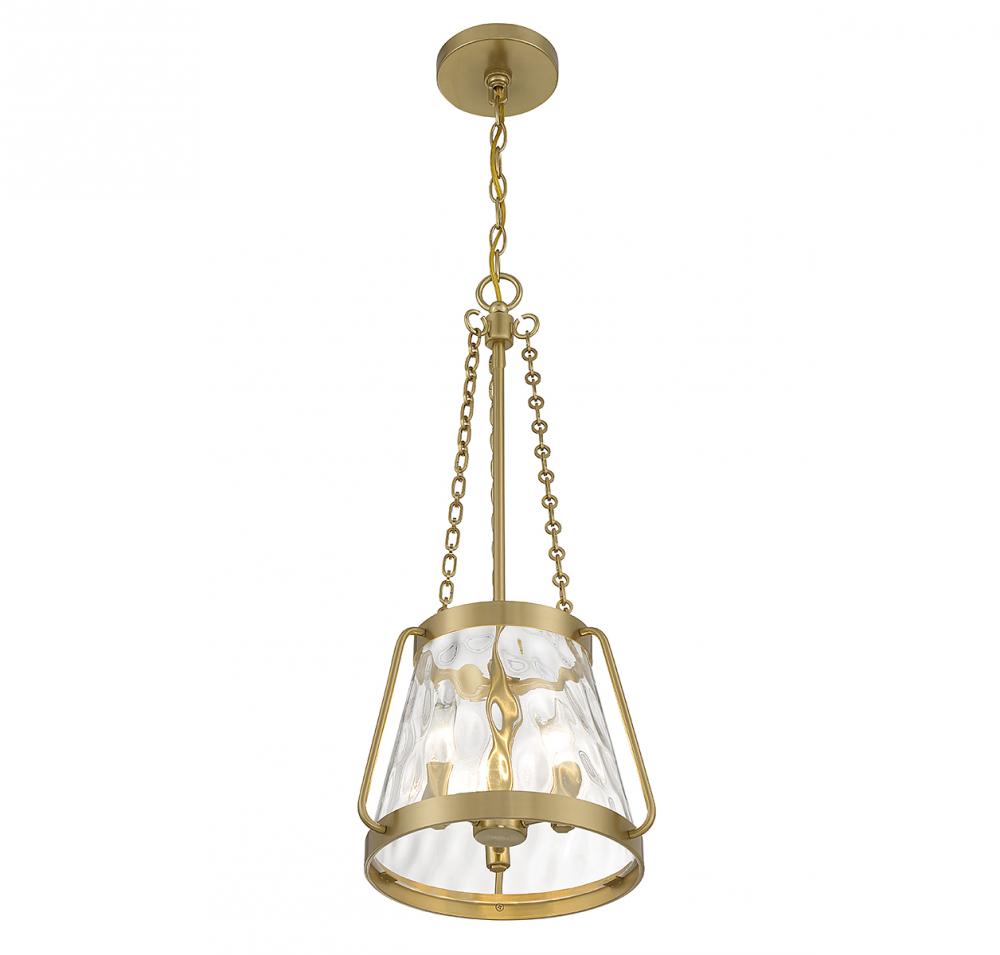 The Savoy House Crawford 3-light pendant proves that a classic style can be stunning! A lantern-inspired shade of clear water glass hangs down from an understated structure with industrial-inspired details. Finished in warm brass. Crawford is 25.5” in height and 12” in width. It uses 3 candelabra size bulbs of up to 60 watts per bulb (bulbs not included).