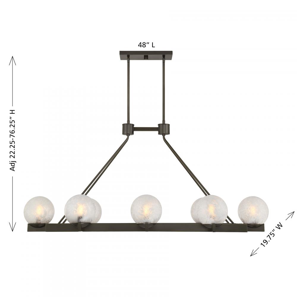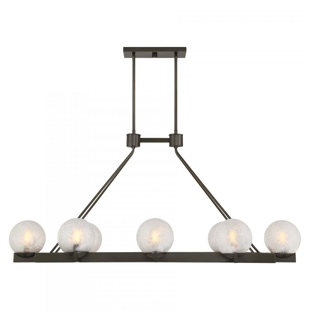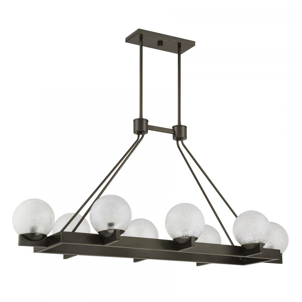 The Savoy House Darien is a 8-light linear chandelier with fabulously chilly appeal. A minimal, elongated frame is finished in bold Mediterranean Bronze and holds eight orbs of Ice Glass, adding sub-zero cool with tons of frosty texture. Darien is 48" in length, 19.75" in width and has an adjustable height ranging from 22.25" to 76.25". Uses eight candelabra size bulbs of up to 60 watts per bulb. Bulbs not included. Comes with eight 12" downrods and two 6" downrods.
