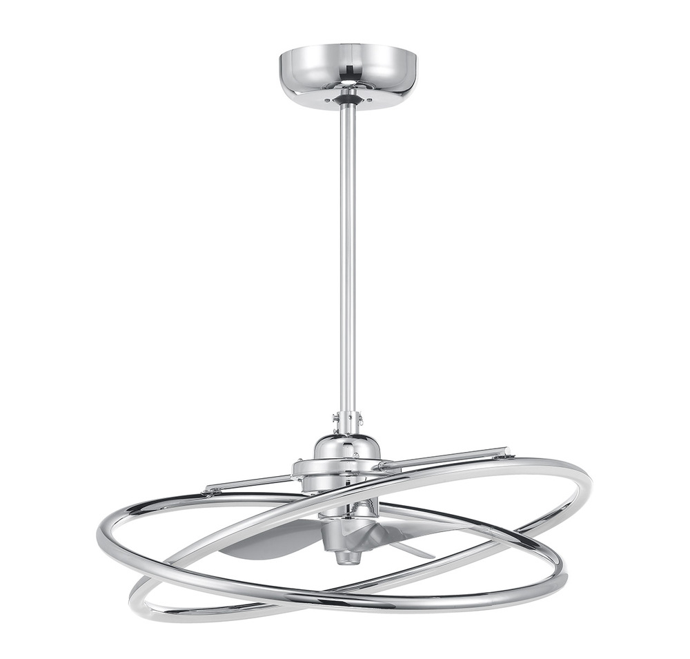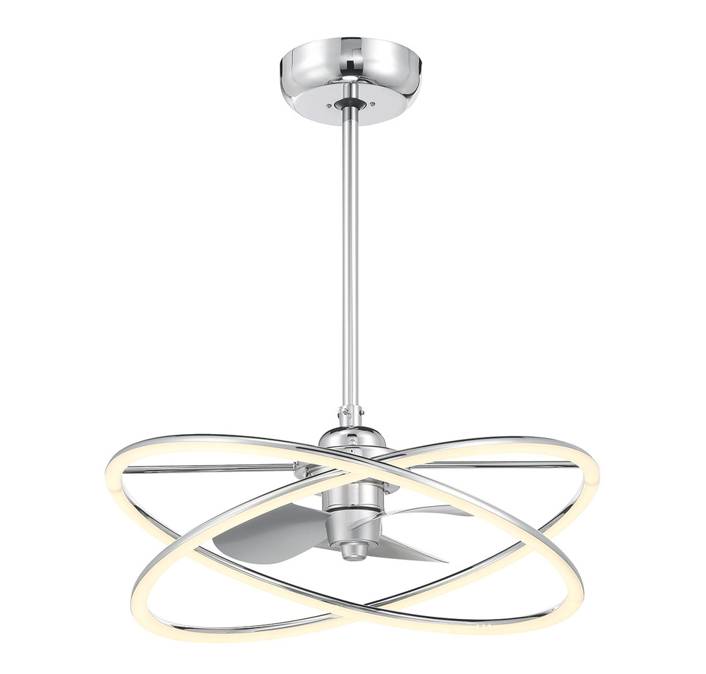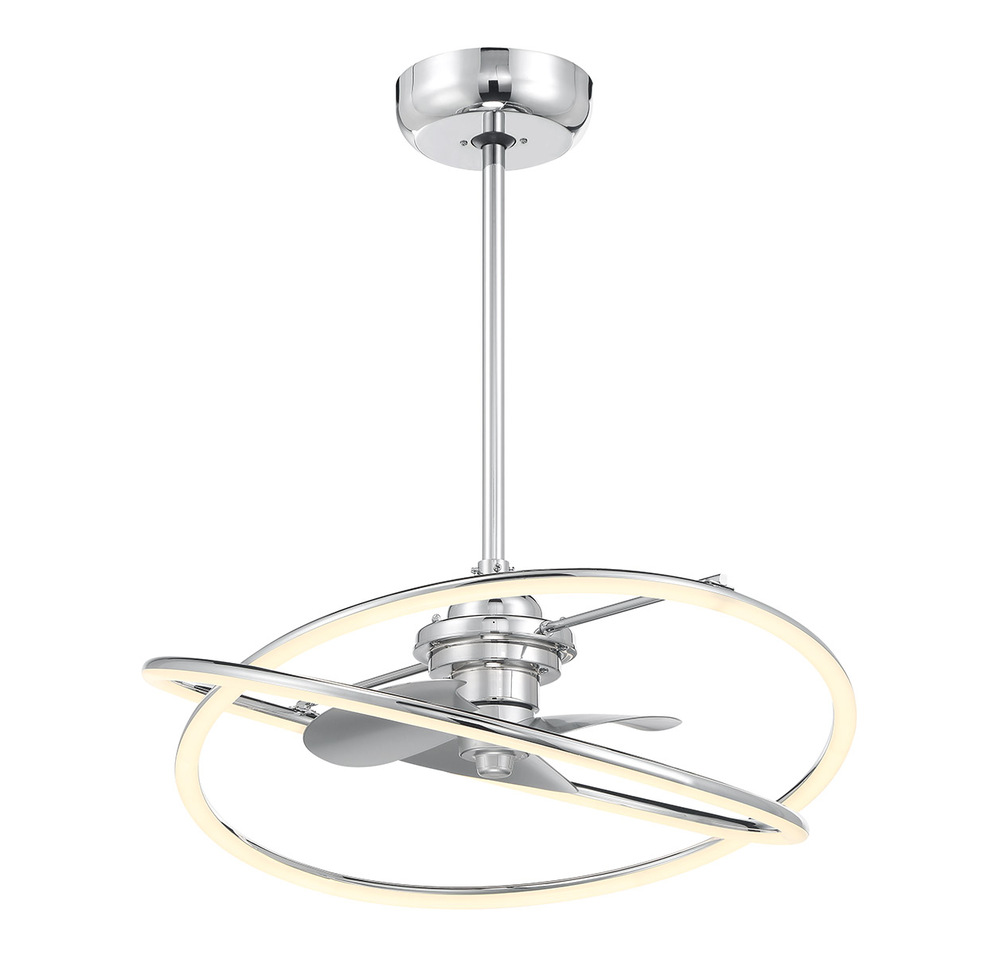 Cool and cutting-edge, the Savoy House Dorado Fan D'Lier reinvents the chandelier and the ceiling fan in one fabulously fashionable fixture. Bands of integrated LED light encircle the fan, which is finished in Polished Chrome. Dorado uses an efficient DC motor and has a handheld remote control for extra convenience. It is 25" in width and 10.5" in height. Comes with a 4" downrod and an 18" downrod. Fan D'Liers are a Savoy House exclusive. These custom designs are inspired by high-end designer styles and take top trends to a whole new level.
