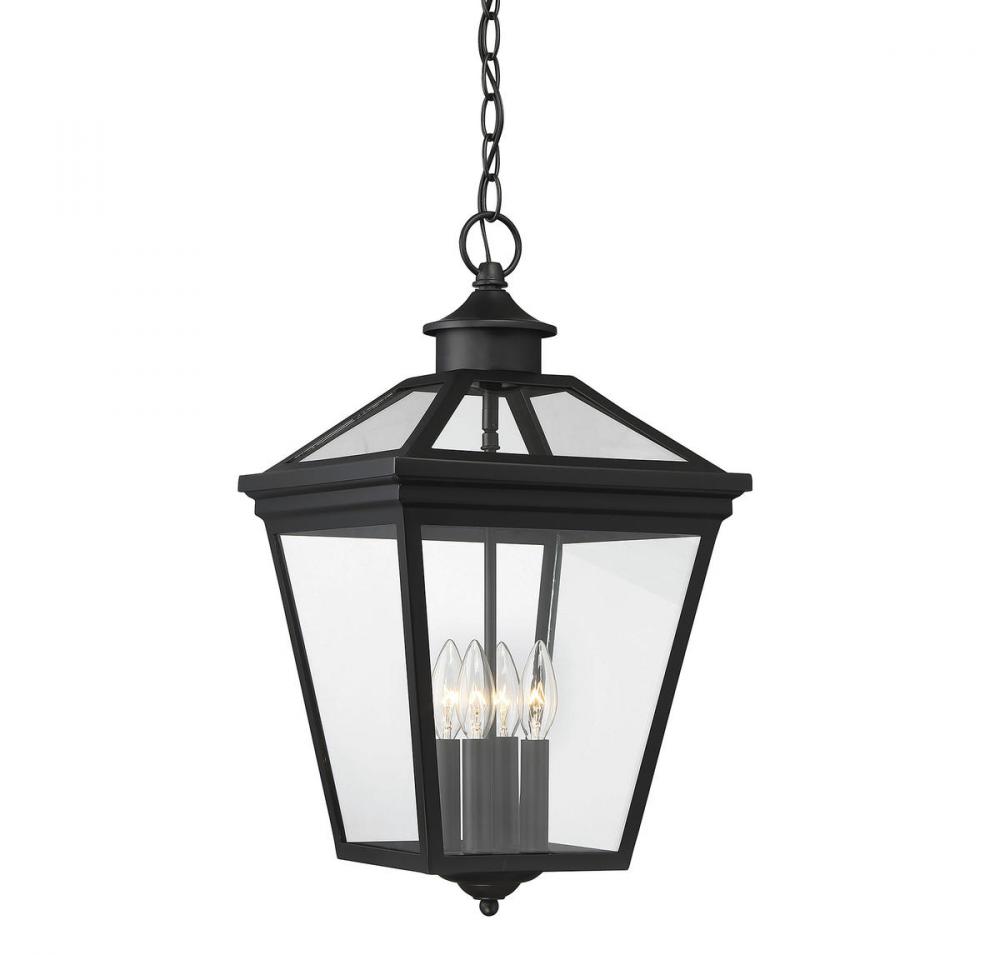Brighten the exterior of your home and welcome your guests in style with the Savoy House Ellijay 4-light outdoor hanging lantern. The design mimics a vintage gas lantern with a classic tapered box shape and decorative top finial. The black finish looks terrific and blends well with other hardware and architectural materials. Panes of clear glass fill all four side panels and the roof panels, too. Four 40W candelabra size bulbs provide inviting and secure illumination. This lantern measures 12" wide and 20.75" high. You’ll enjoy its timeless style and enhance the beauty of your property, whether on your porch, patio, sunroom, pergola or hung from other outdoor ceilings in your garden and yard.