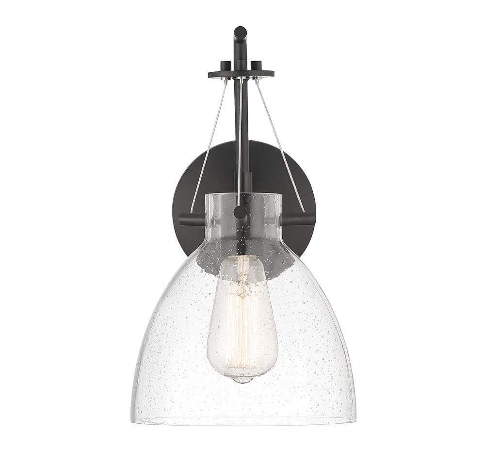 The Savoy House Foster 1-light sconce is the perfect way to add a sleek look to any space. Its large shade of clear seeded glass has a pleasantly curving shape and pairs nicely with the matte black finish. Foster is 14" in height, 8" in width and extends 10" from the wall. It uses 1 standard size bulb with a max of 60 watts (bulb not included).