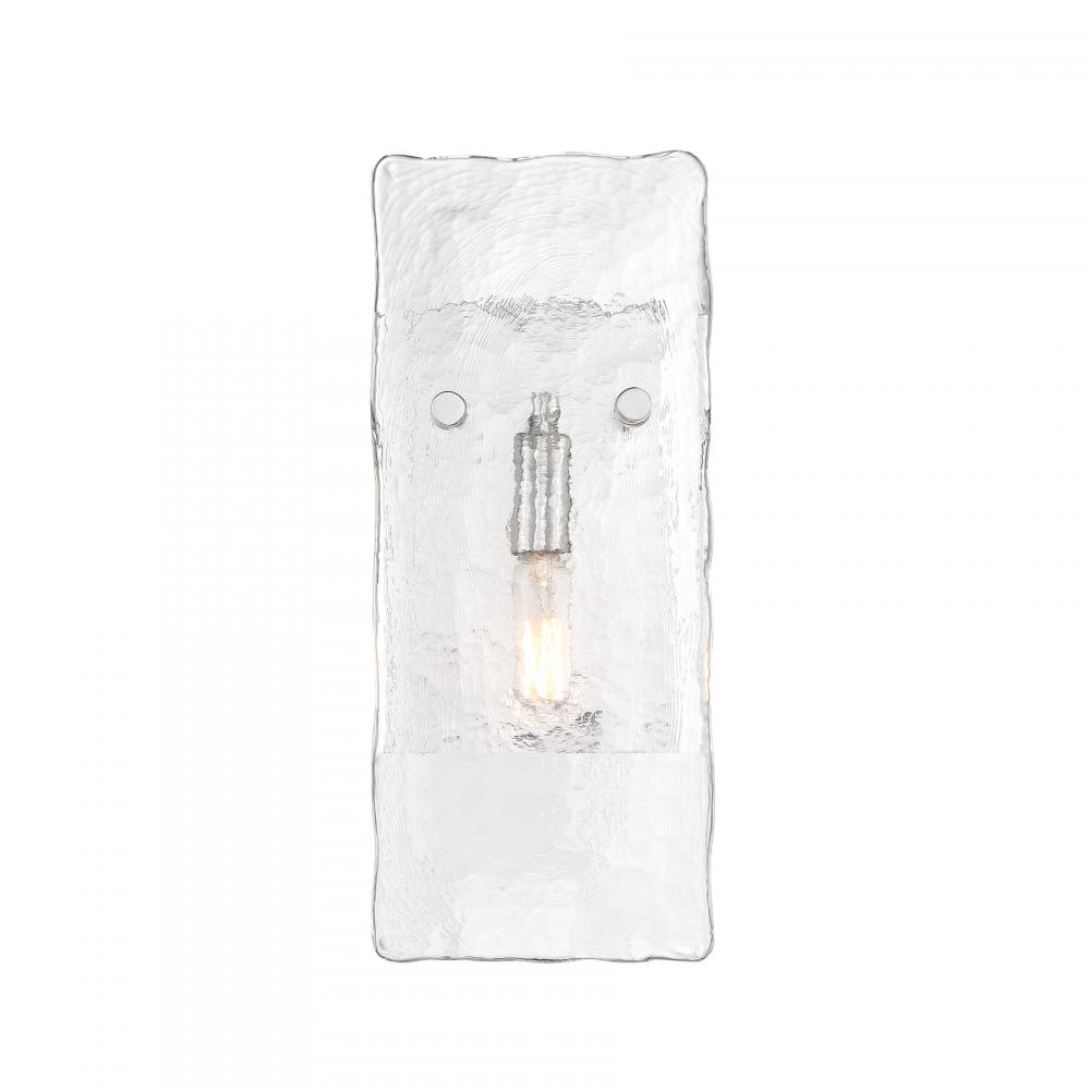 Bring a beautiful ocean-inspired lighting look to your home with the Savoy House Genry 1-light sconce. It is decorated with a rippling pane of handmade glass and finished in Polished Nickel. Genry is 13" in height, 5.5" in width and extends 5.5" from the wall. It uses one candelabra size bulb of up to 60 watts. The bulb is not included. This sconce is damp area rated.