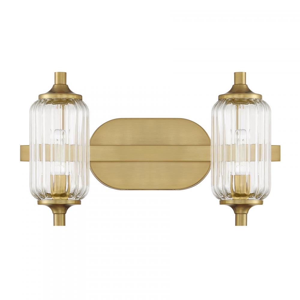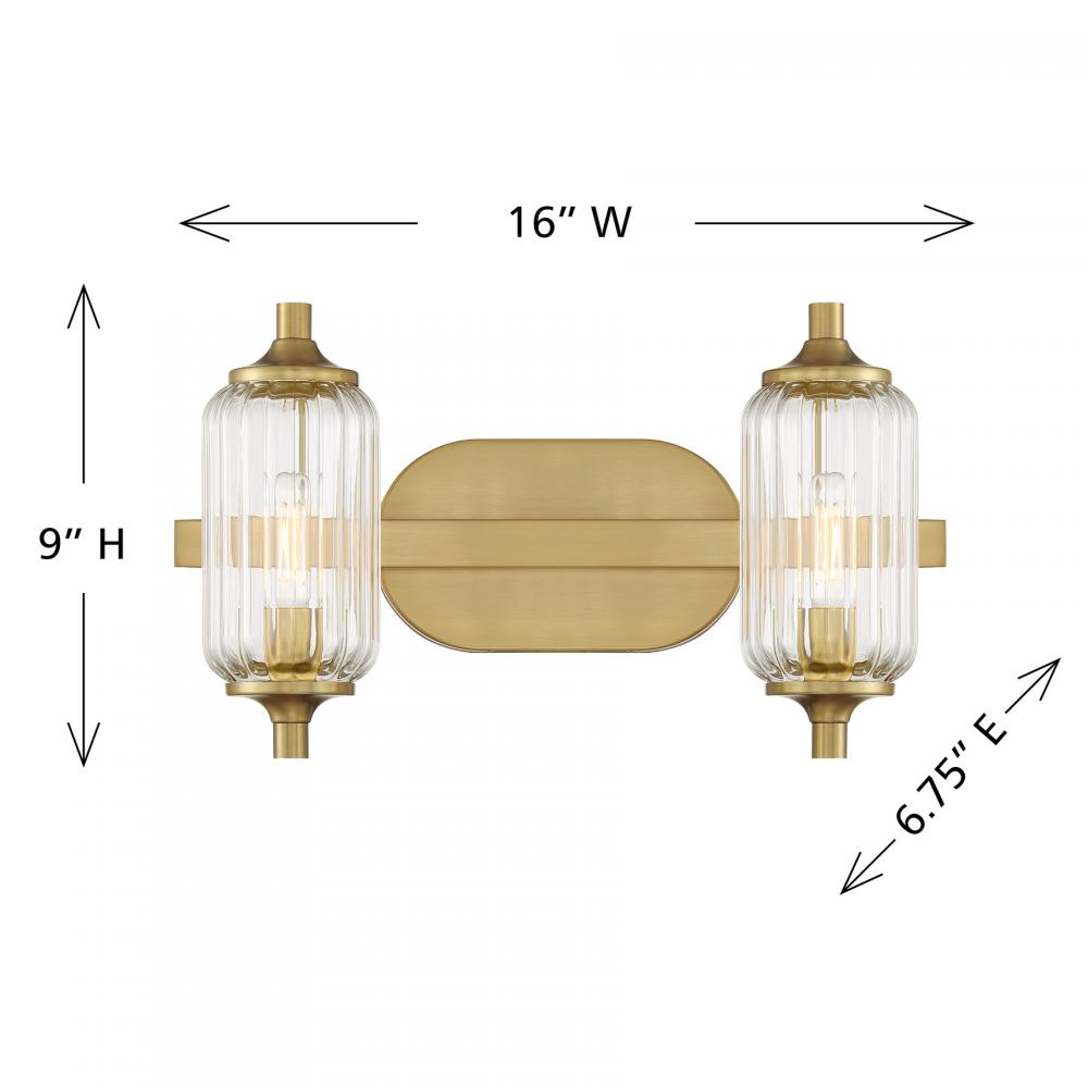The Savoy House Holton 2-light bath light showcases an inventive and geometric style with tall, rounded shades of clear ribbed glass and a slim, rounded structure finished in Warm Brass. It will bring a big dose of style to any bathroom! Holton is 9" in height, 16" in width and extends 6.75" from the wall. It uses two candelabra size bulbs of up to 60 watts per bulb. Bulbs not included. Install as shown. This bath bar is damp area rated.