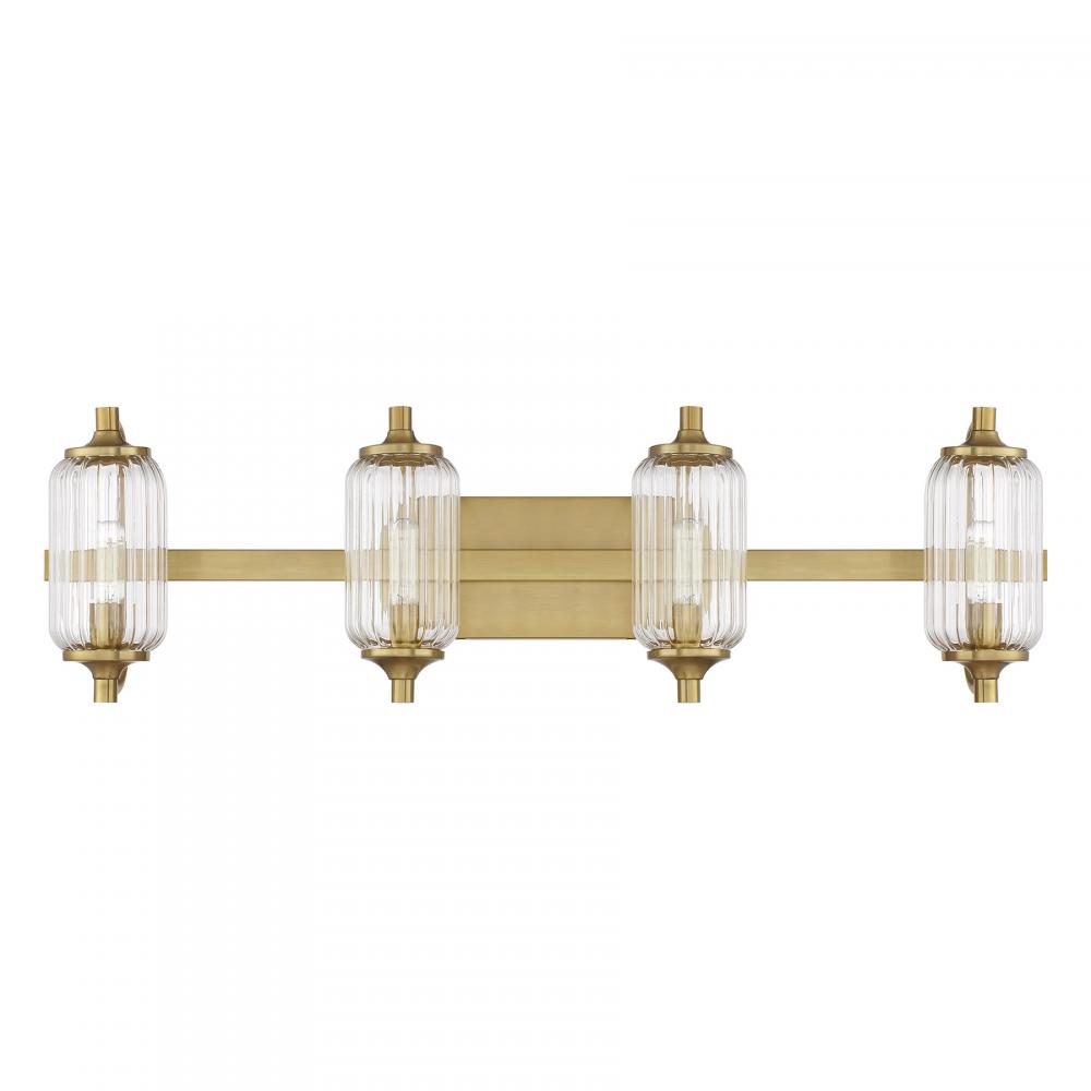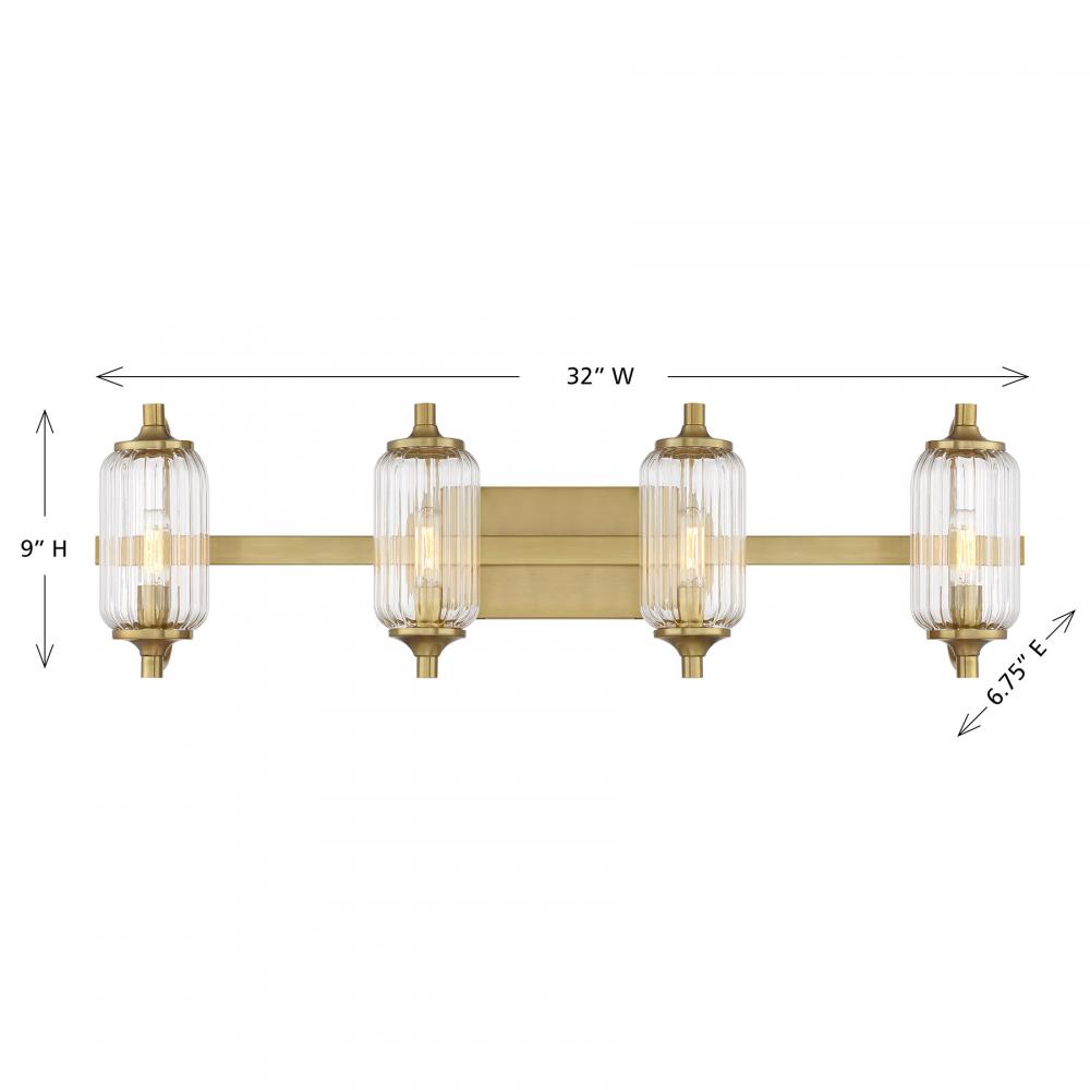 The Savoy House Holton 4-light bath light showcases an inventive and geometric style with tall, rounded shades of clear ribbed glass and a slim, rounded structure finished in Warm Brass. It will bring a big dose of style to any bathroom! Holton is 9" in height, 32" in width and extends 6.75" from the wall. It uses four candelabra size bulbs of up to 60 watts per bulb. Bulbs not included. Install as shown. This bath bar is damp area rated.