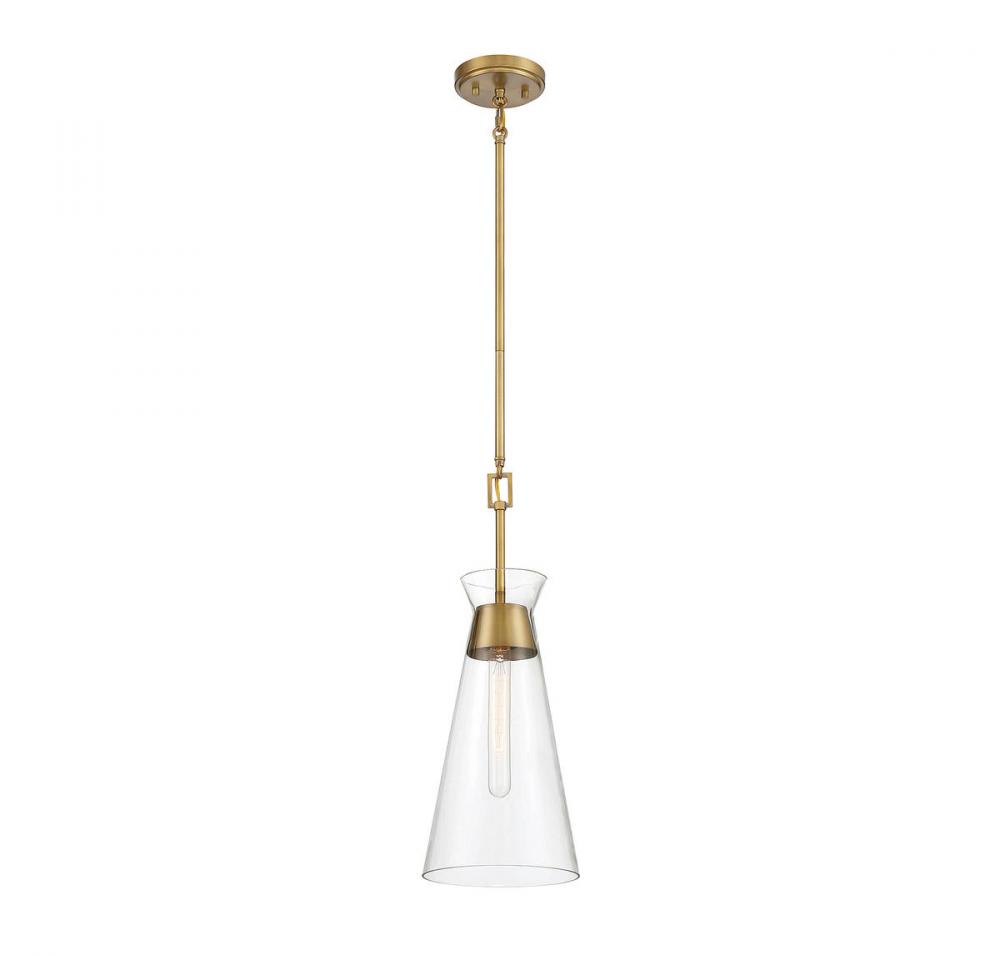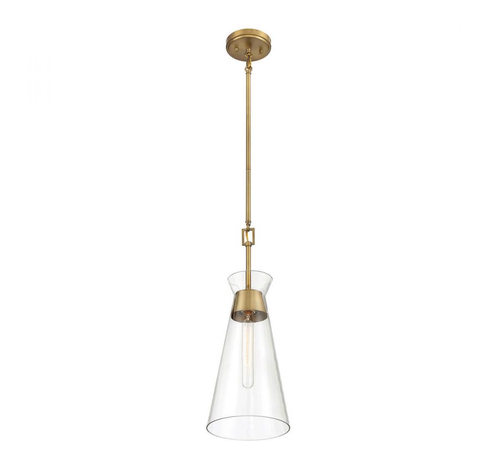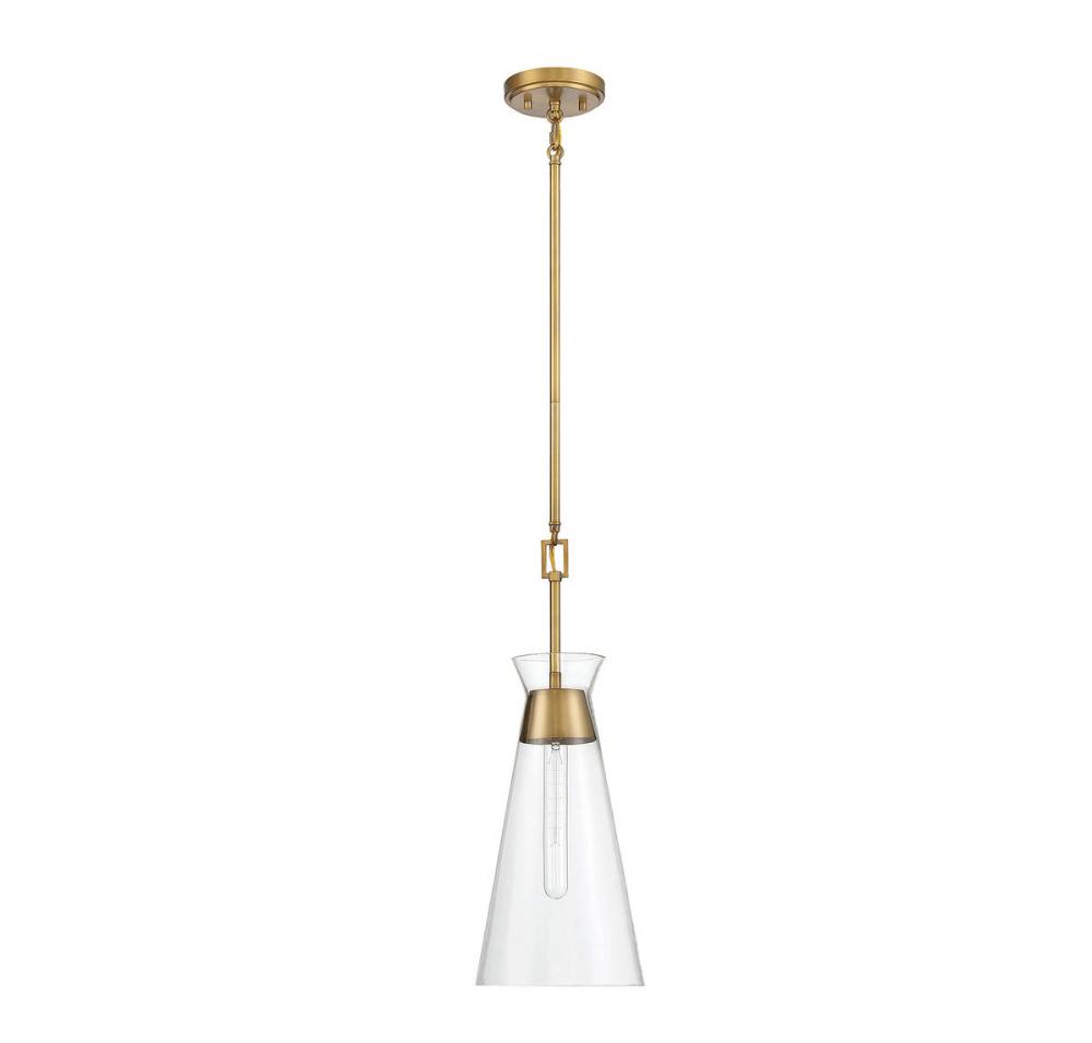 A conical shade of clear glass recalls Italian midcentury modern lighting designs in the stylish Lakewood 1-light mini pendant from Savoy House. The fixture is finished in rich warm brass. Lakewood is 8" in diameter and has an adjustable height ranging from 31.5" to 50.5". It uses one standard size bulb with a max of 60 watts. Comes with three 9.5" downrods and 120" of cord.