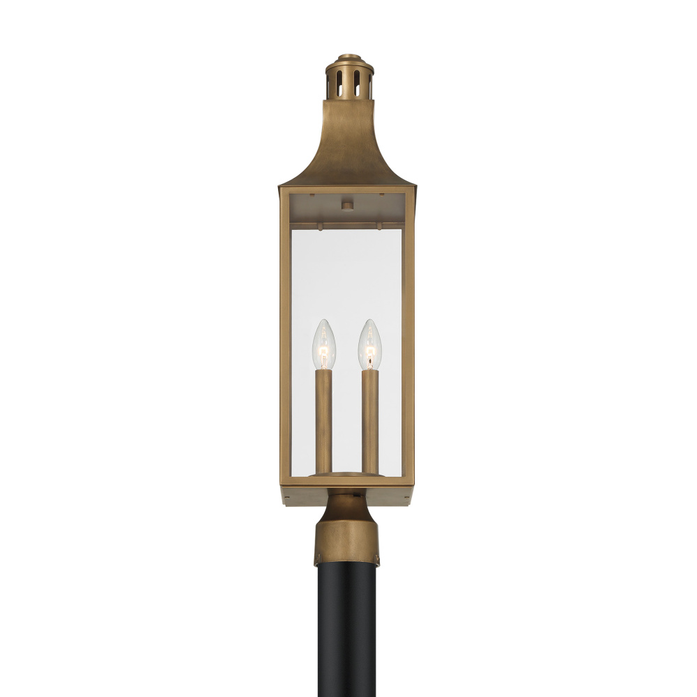 Create a welcoming, well-lit outdoor environment with the Savoy House Lancaster 2-light post mount lantern. Its traditional lantern architecture, complete with a graceful roof and chimney detailing, lends sophistication to walkways, driveways, or garden paths. Clear glass panels allow light to travel freely and are paired with the warm richness of Atlas Bronze. Lancaster stands 27" tall and 7" wide. Uses two candelabra bulbs of up to 60 watts each (not included). Wet area rated.