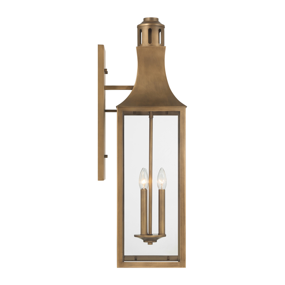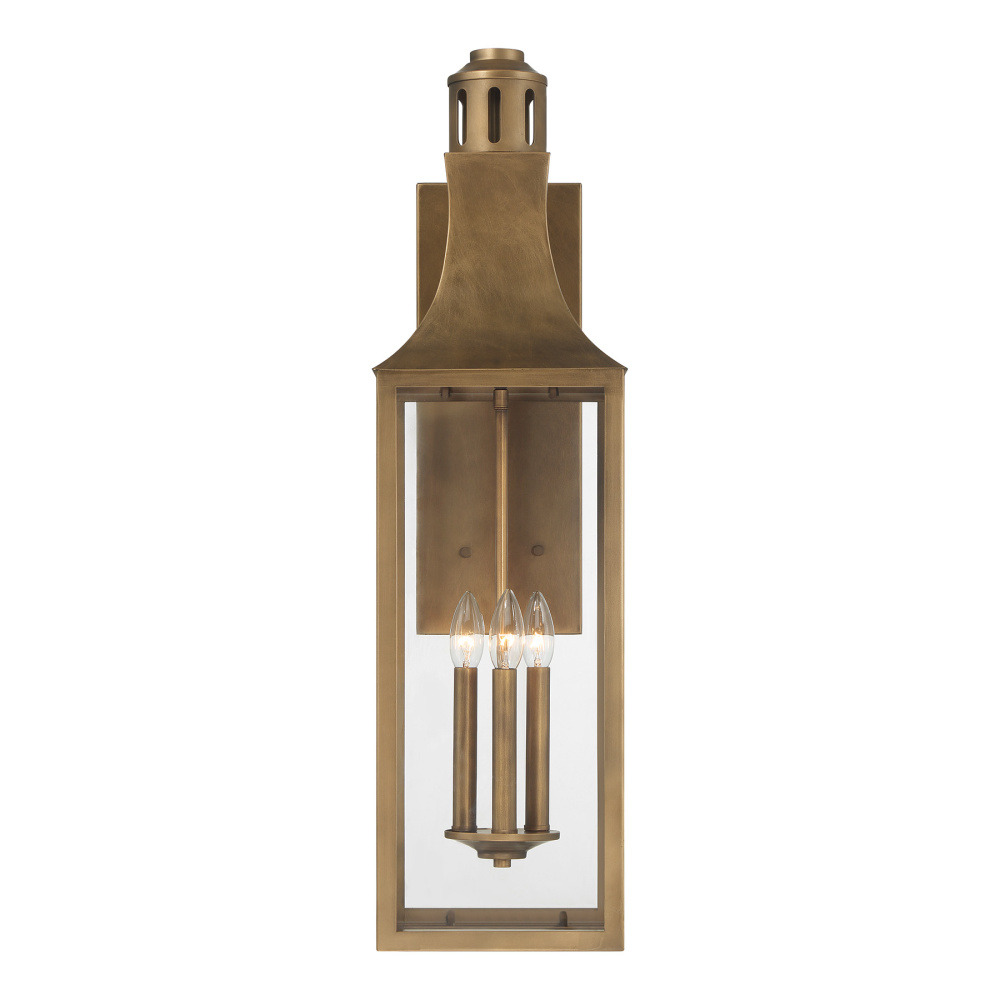 Light the way home with the stately, traditional charm of the Savoy House Lancaster 3-light outdoor wall light. Its tall, lantern-style silhouette features a gently curved roofline and a classic chimney detail. These timeless touches elevate its welcoming presence on any exterior. Clear glass panels ensure bright, beautiful illumination, while the Atlas Bronze finish wraps the look in a warm, inviting glow. Lancaster stands 31.75" in height, 9" in width, and extends 11.5" from the wall. It uses three candelabra-size bulbs, each up to 60 watts (bulbs not included). Wet area rated, so it’s ready for use in both covered and uncovered outdoor spaces.