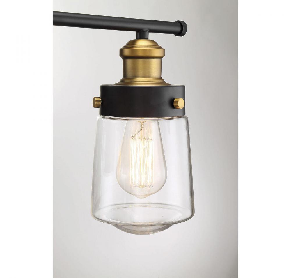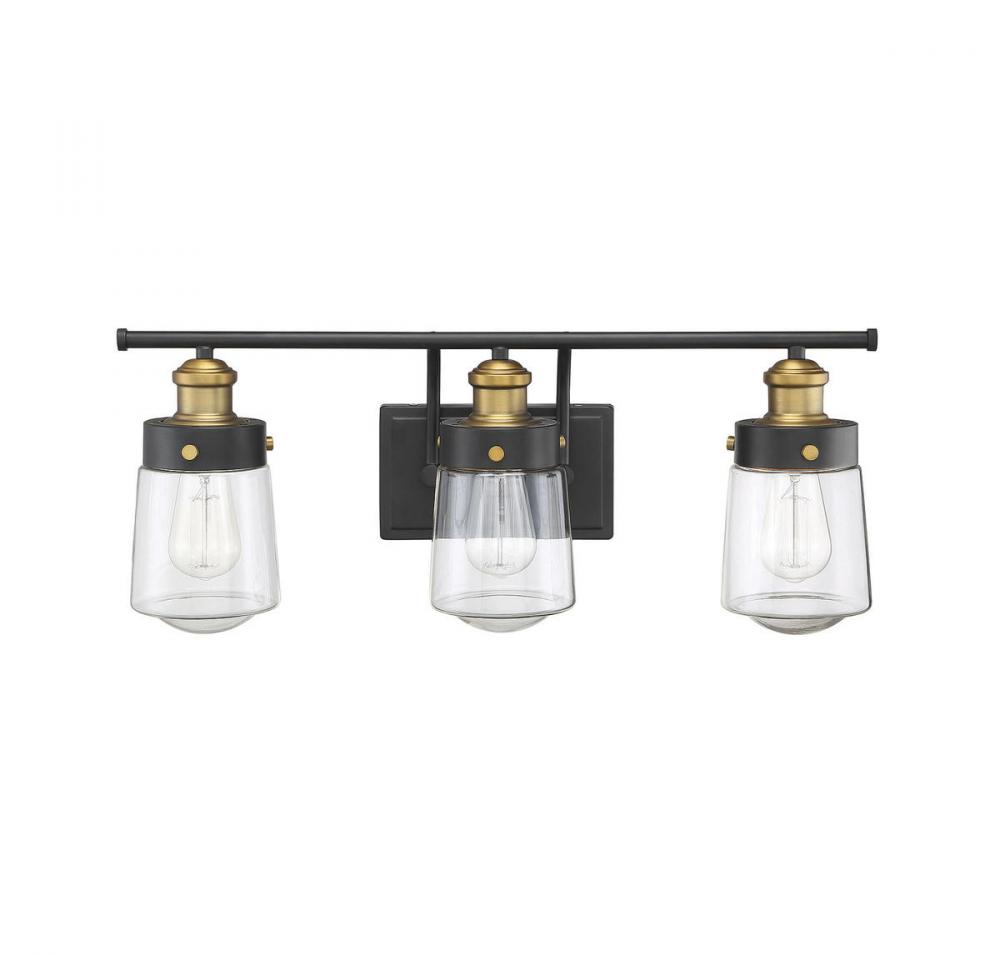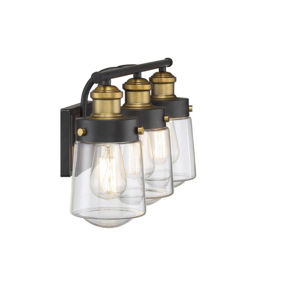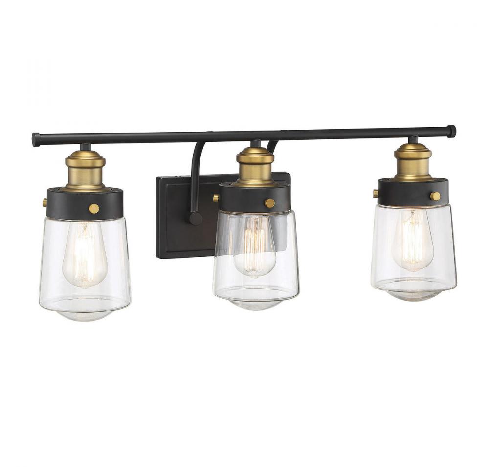The ever-so-stylish, vintage-inspired look of the Macauley collection from Savoy House is now available as bath lights, including this 3-light bath bar. This fixture expertly combines schoolhouse-style molded glass shades, noticeable details like thumbscrews and the perfect pairing of black and brass to create a look that is sure to please. This fixture is 24" wide and 9.75" tall. It extends 6.75" from the wall. Uses 3 standard size bulbs of up to 60 watts each (not included).
