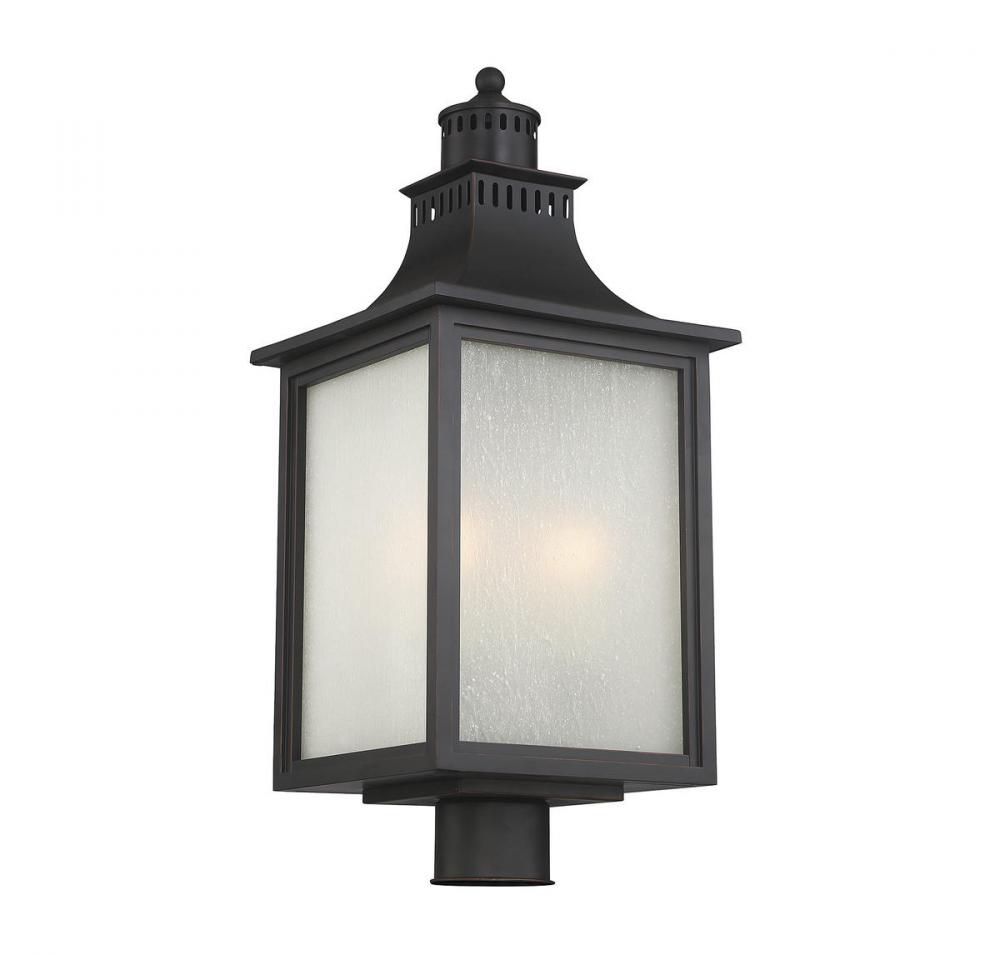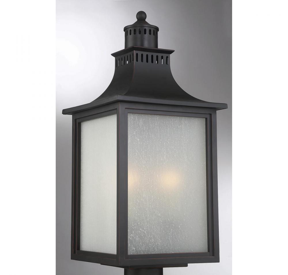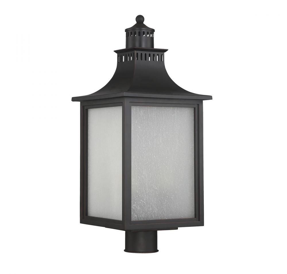 The Savoy House Monte Grande 3-light outdoor post lantern is an elegant, clean-lined version of a classic box-shaped lantern. It’s a timeless and pleasing style from designer Karyl Pierce Paxton, a wall lantern that will illuminate the exterior of your home and welcome you and your guests with a familiar, traditional aesthetic. The English bronze finish is a wonderful neutral and the panels are made of beautiful pale cream seeded glass. Three 40W candelabra size bulbs provide plenty of soft light. This lantern is 10" wide, 23.75" high and UL rated for wet locations.