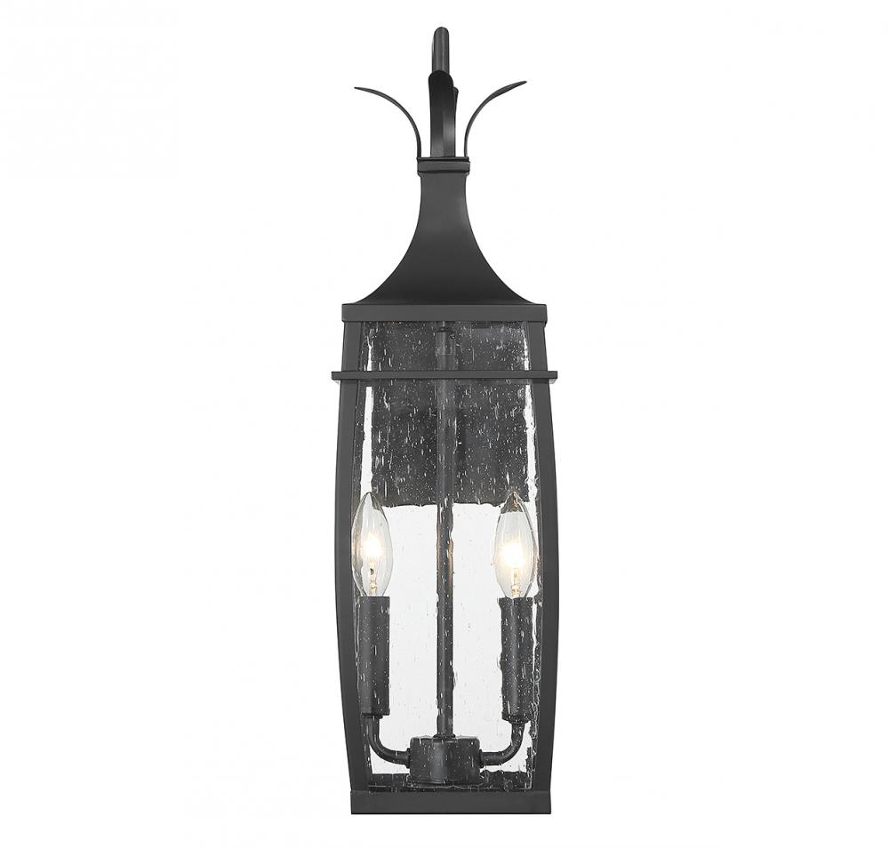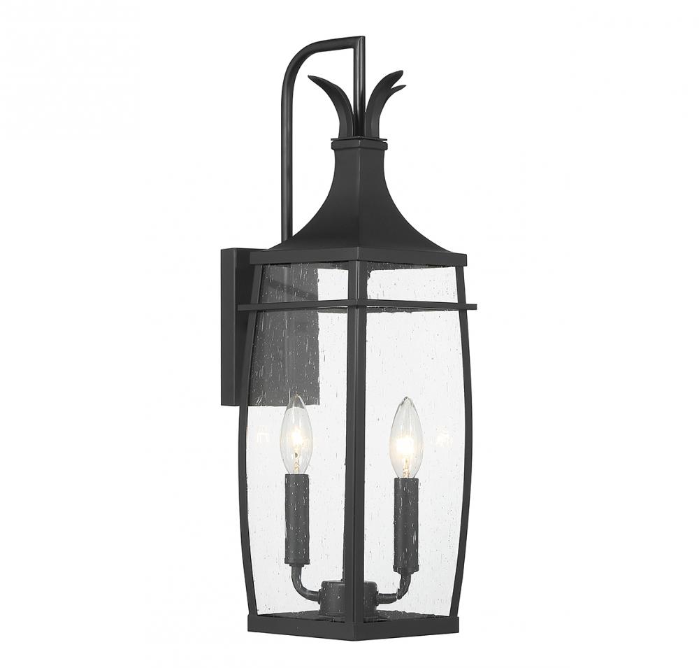 A hint of nature-inspired detailing decorates the top of this Savoy House Montpelier 2-light outdoor wall light. Its slightly curved structure features panes of clear seeded glass and is finished in a classic matte black. Montpelier is 22" in height, 6.25" in width and extends 8.25" from the wall. It uses 2 candelabra size bulbs with a max of 40 watts per bulb (bulbs not included).