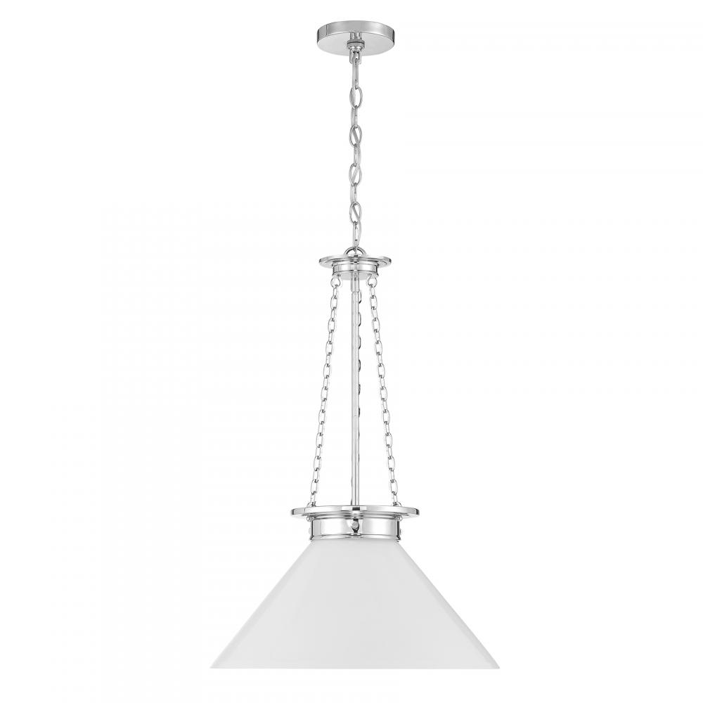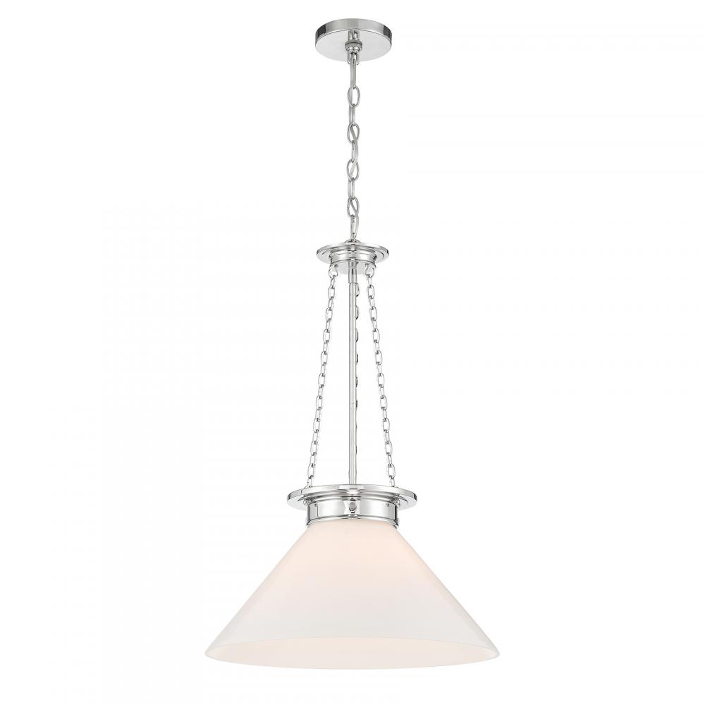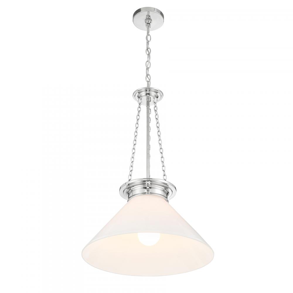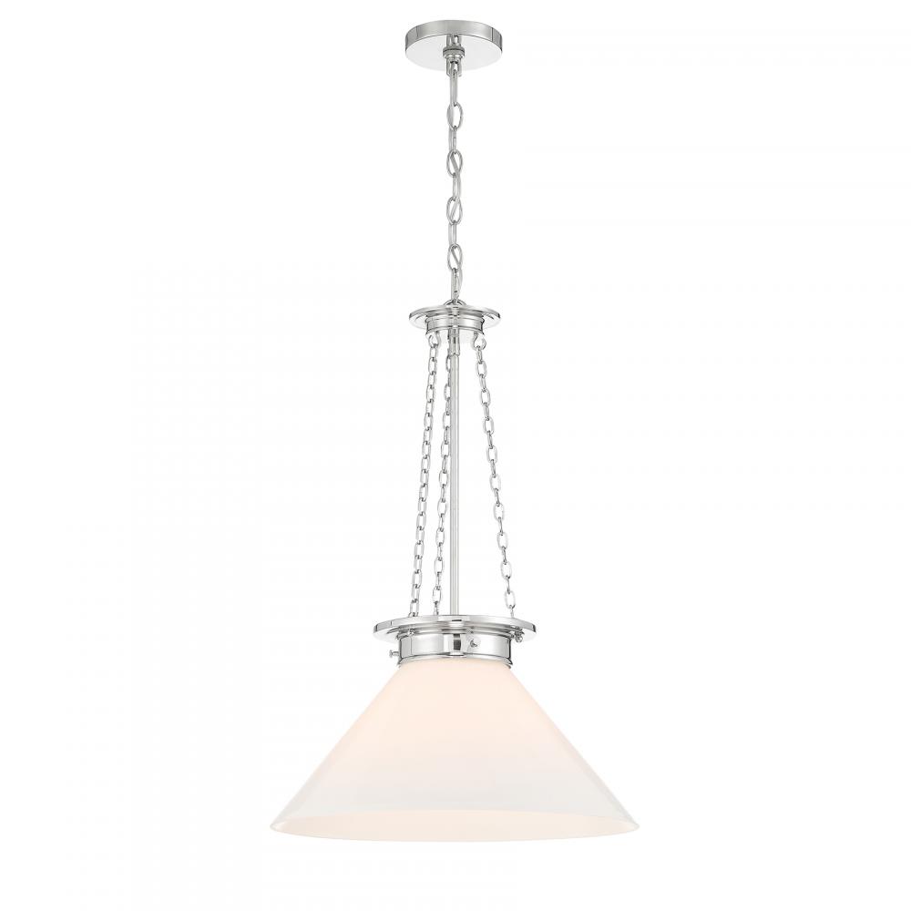 Bring in a bright, vintage-inspired lighting look with the Savoy House Myers 1-light pendant. Its white cased glass shade has a rich and lustrous appearance that makes it ideal for a wide variety of applications. Slim strands of chain add a decorative touch and heighten the vintage intrigue. Finished in Polished Nickel. Myers is 27" in height and 18" in width. Uses one standard size bulb of up to 60 watts. The bulb is not included.