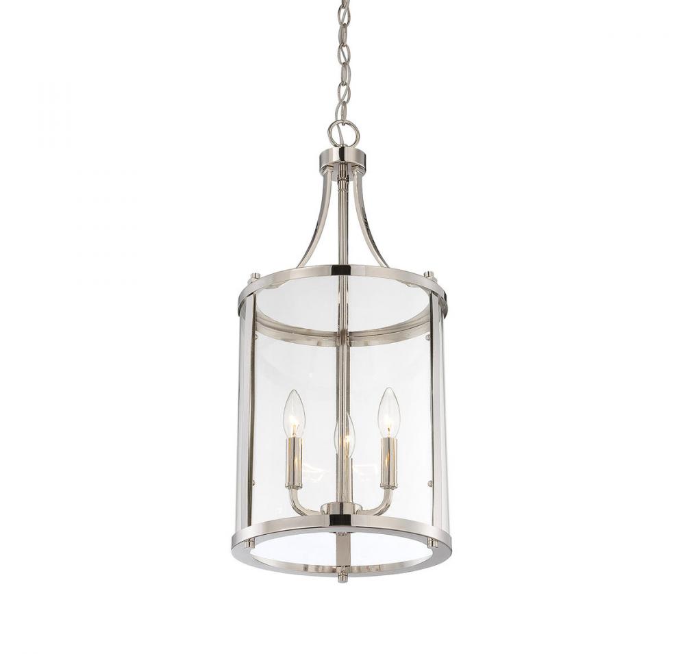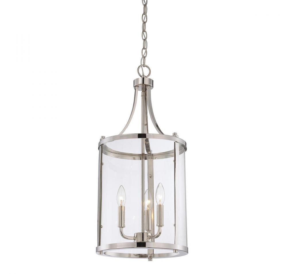 This sleek, cylindrical Penrose 3-light foyer light from Savoy House is an excellent choice for lovers of stylish modern design. It features clear glass and is finished in shining polished nickel. Foyer lights are often used in foyers and entryways, but can also be used in great rooms, kitchens, offices and bedrooms too! Bulbs not included. Try using stylized bulbs for a different look! The polished nickel finish can be matched with nickel hardware or mixed with hardware in other finishes. Bring Penrose into rooms of any style, especially transitional or classic, for a big touch of lighting allure. When you choose a Savoy House lighting fixture, you can be certain you've selected a piece that will withstand the test of time.