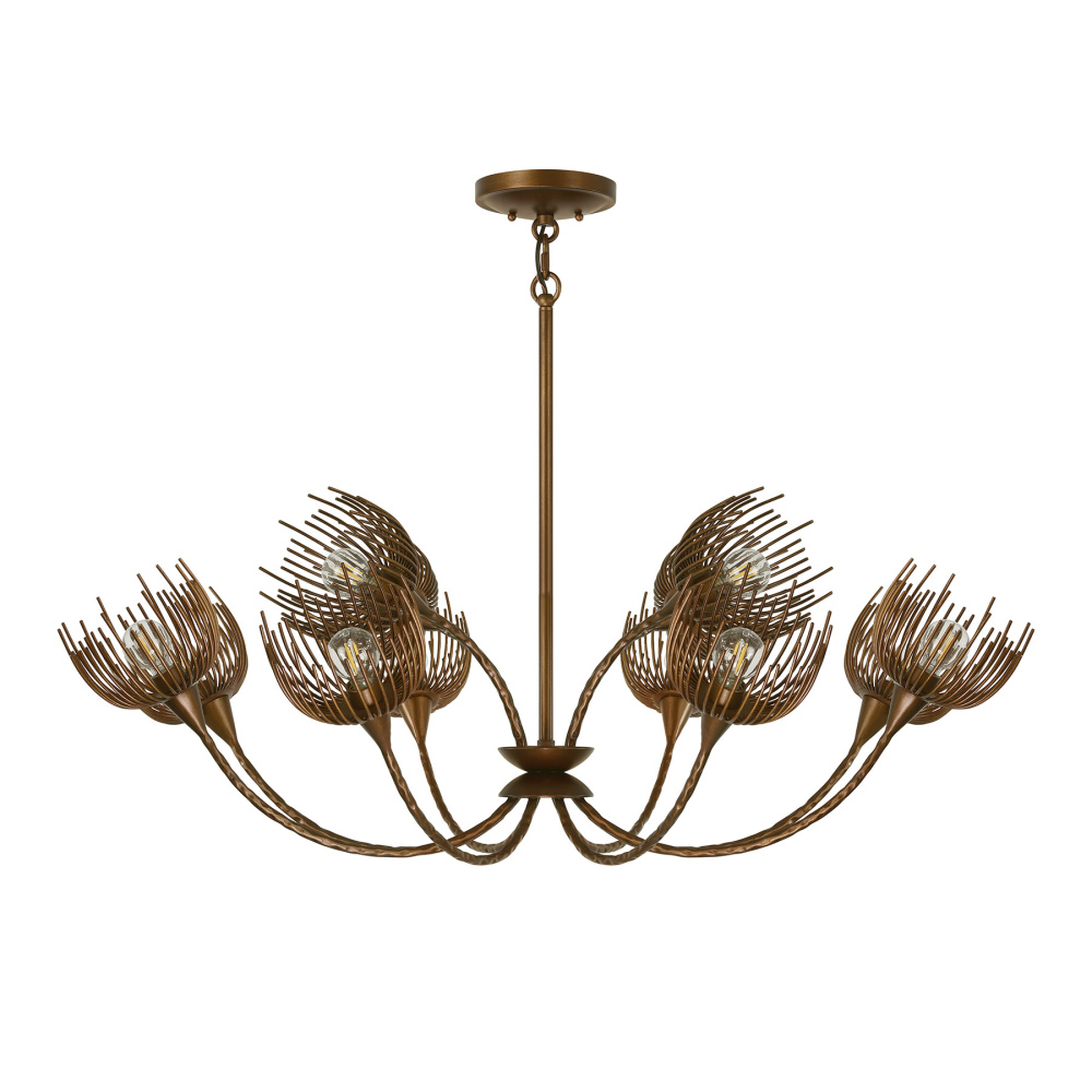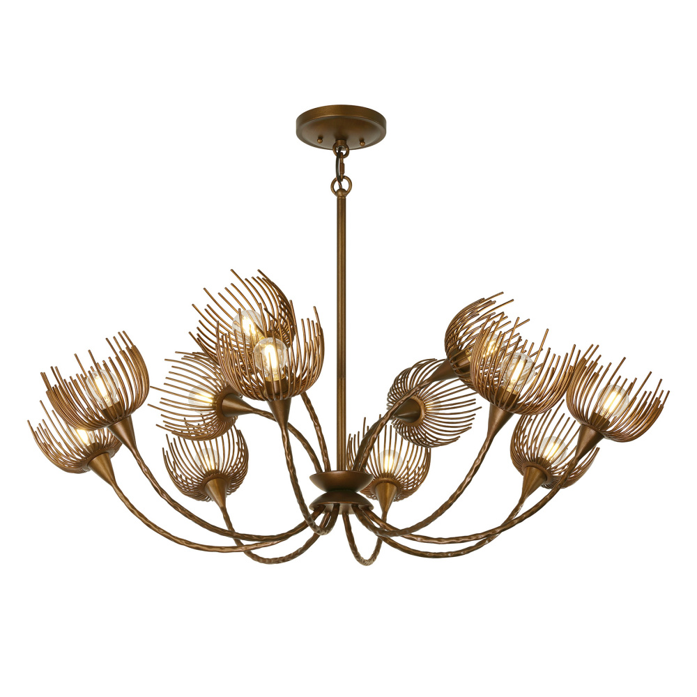 The Savoy House Protea 12-light pendant was designed by award-winning interior designer and TV host Breegan Jane. It is named for a beautiful African flowering plant that is also known as the sugarbush. The sugarbush has a distinctive shape that is portrayed here with gently curving hammered arms topped by delicate blossoms, all finished in a rich bronze Manchester finish hand-painted by artisans. Protea is 40" in width and has an adjustable height ranging from 15.5" to 69.5". It uses twelve candelabra size bulbs of up to 60 watts per bulb. Bulbs not included. Comes with four 12" downrods and one 6" downrod.