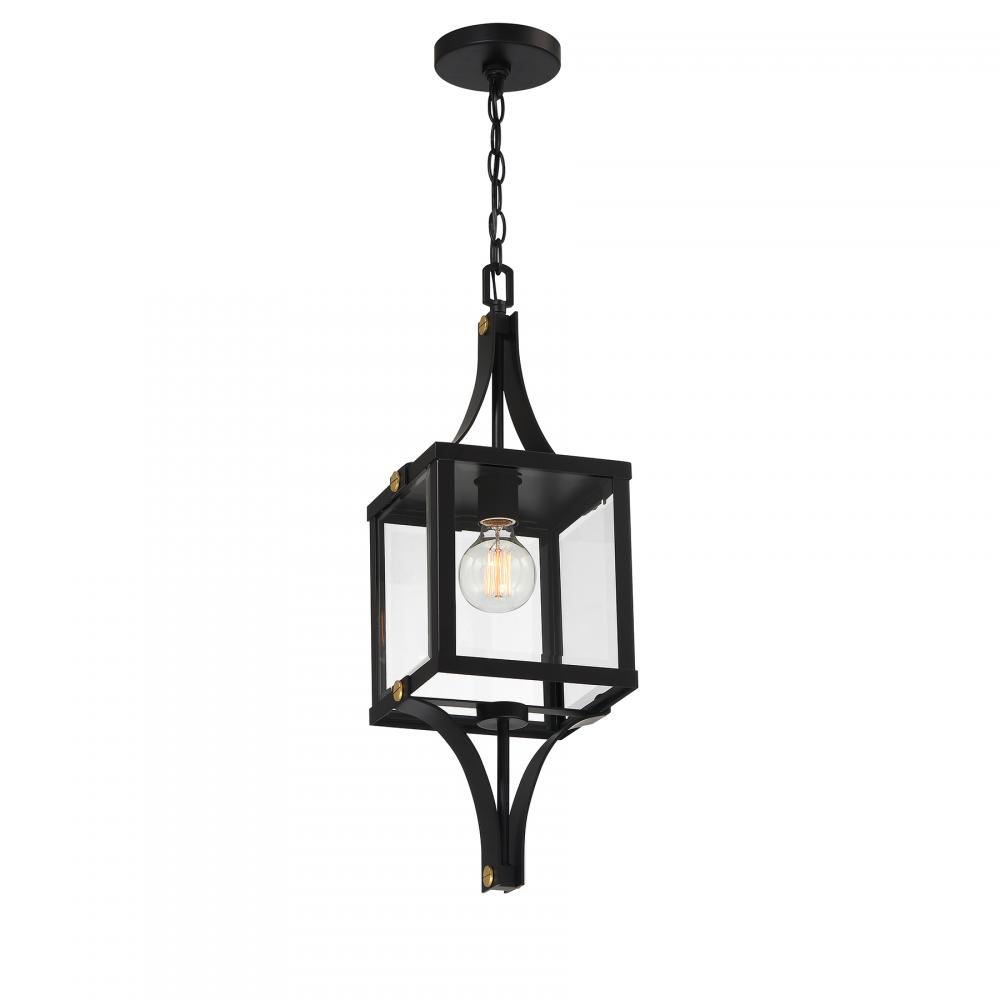 Make your outdoor lighting super fashionable with the Savoy House Raeburn 1-light outdoor hanging lantern. A central cube of beveled clear glass is surrounded by a boldly structured frame finished in Matte Black and adorned with thoughtful detailing in Weathered Brushed Brass. Raeburn is 25" in height and 8.5" in width. Uses one standard size bulb of up to 60 watts. The bulb is not included. Damp area rated.