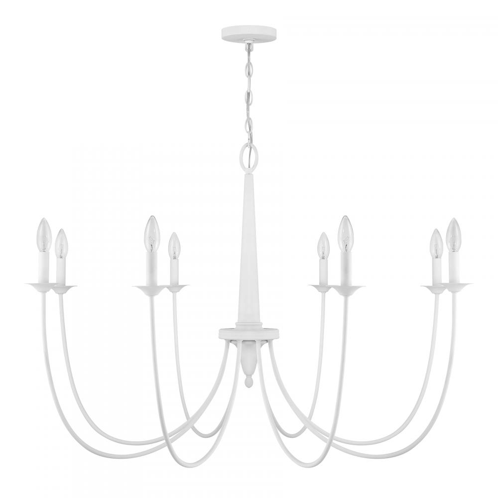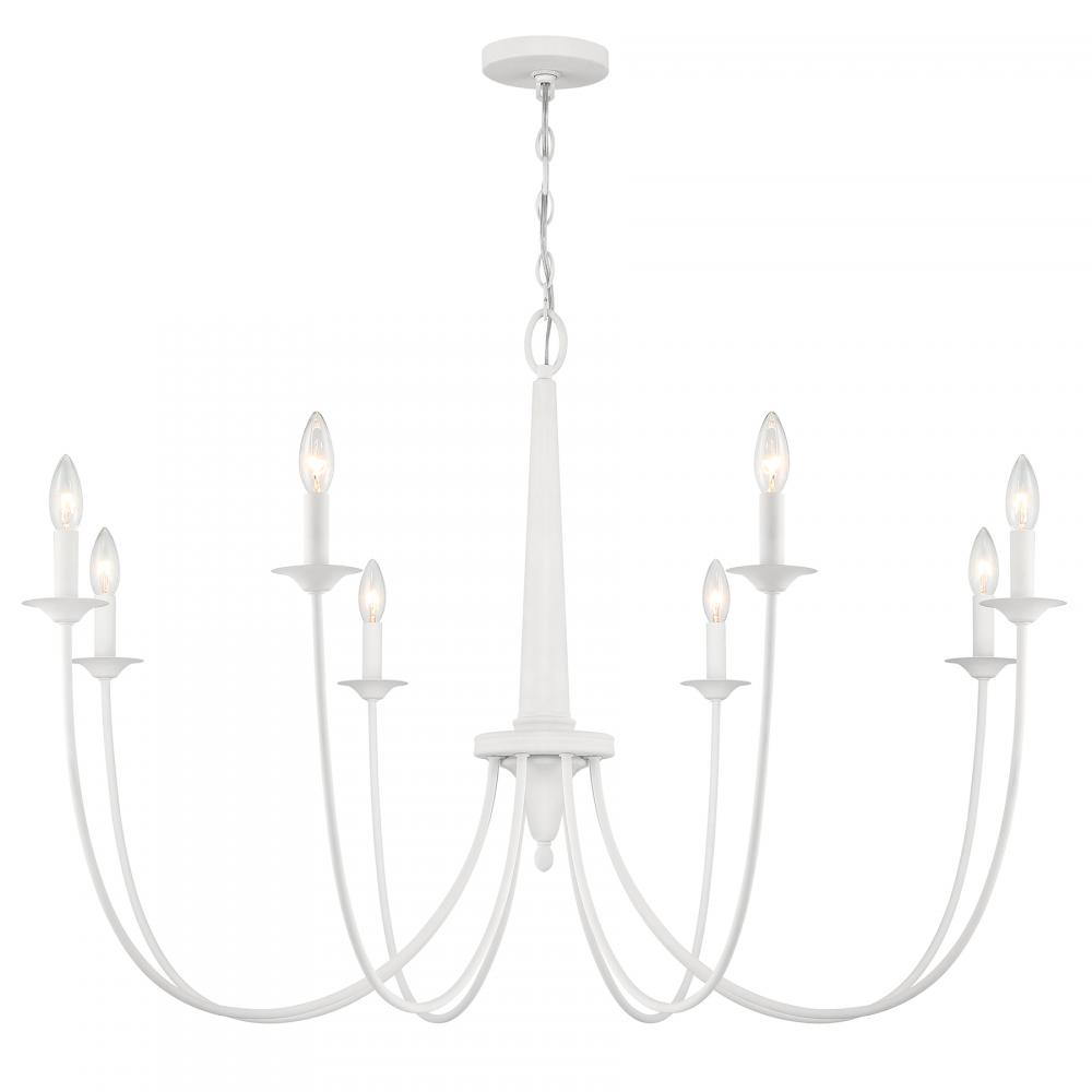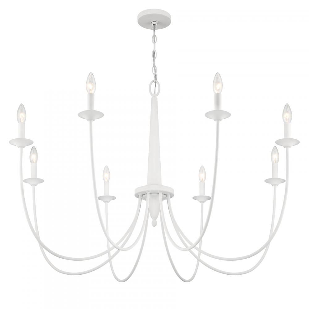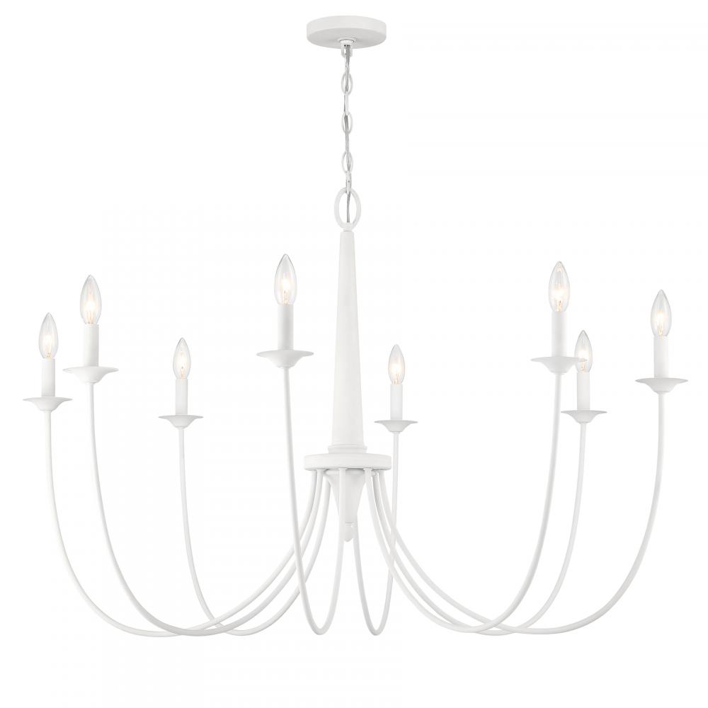 From Savoy House, the Stonecrest 8-light chandelier is a superb way to adorn your home with rustic style. Slim, dramatically curving arms showcase minimal yet beautiful candle cups. The central column also features a thoughtful touch of down-home detailing. It's all decorated in Bisque White, a textured and intriguing finish. Bryant is 28" in height and 42" in width. Uses eight candelabra size bulbs of up to 60 watts per bulb. Bulbs not included.