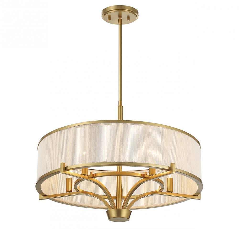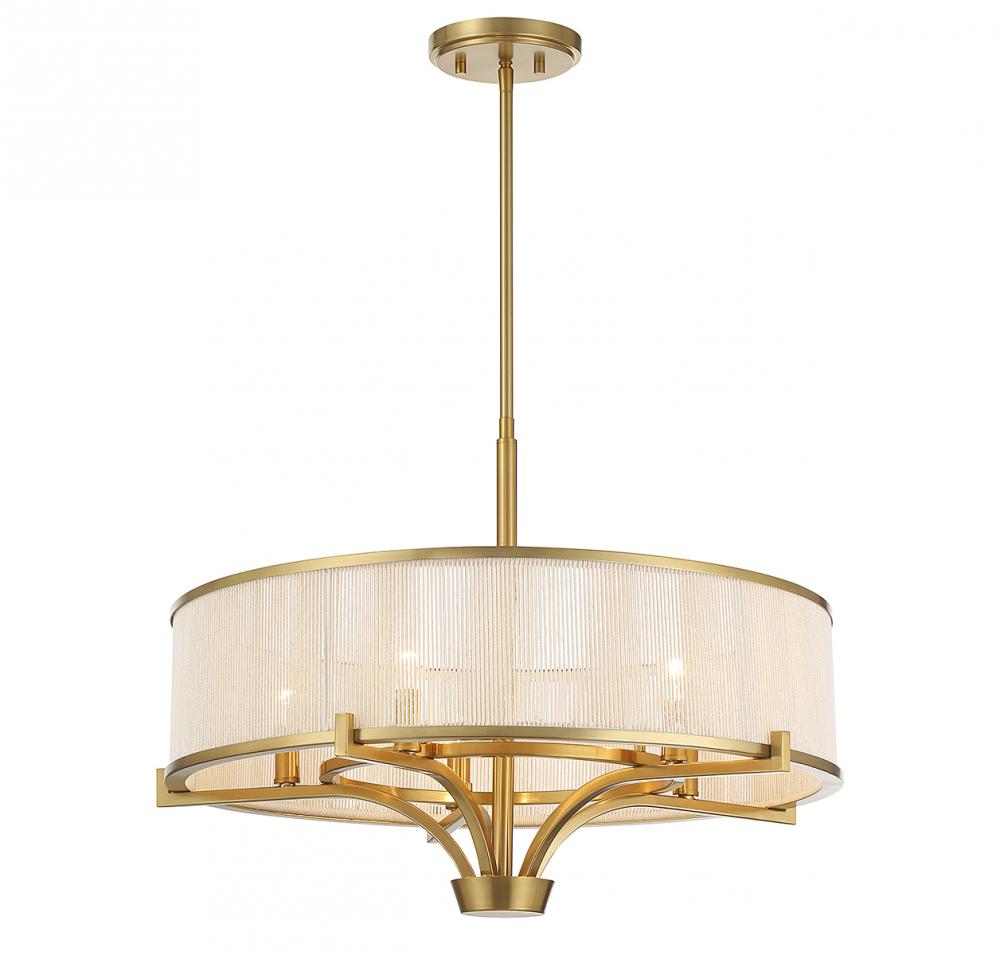 A boldly classic structure is given a touch of organic softness in this Savoy House Wynwood 5-light chandelier. Its shade showcases soft white string that, when combined with the warm brass finish, offers up a beautifully elegant effect. Wynwood is 24" in width and has an adjustable height ranging from 18" to 71.5". Comes with four 12" downrods and one 6" downrod. Uses 5 candelabra size bulbs of up to 60 watts per bulb (bulbs not included).