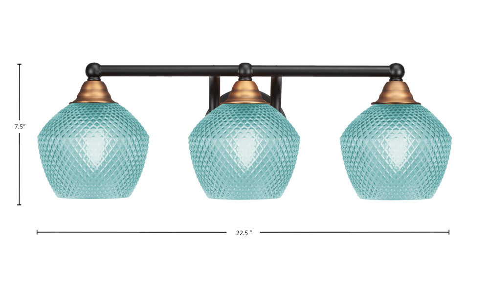 Paramount 3 Light Bath Bar Shown In Matte Black & Brass Finish With 6 Turquoise Textured Glass