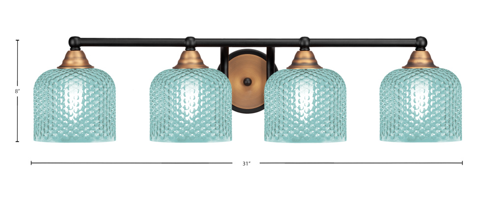 Paramount 4 Light Bath Bar Shown In Matte Black & Brass Finish With 6 Turquoise Textured Glass