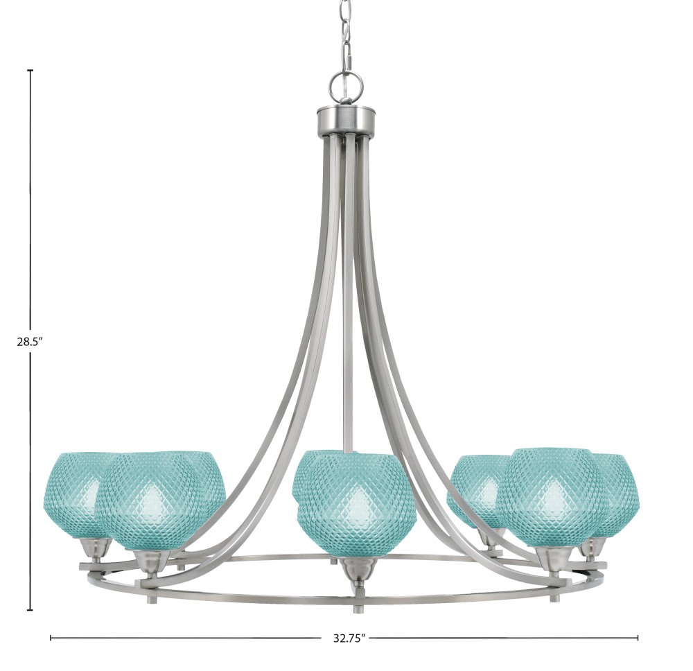 Paramount 8 Light Uplight Chandelier Shown In Brushed Nickel Finish With 6 Turquoise Textured Glass