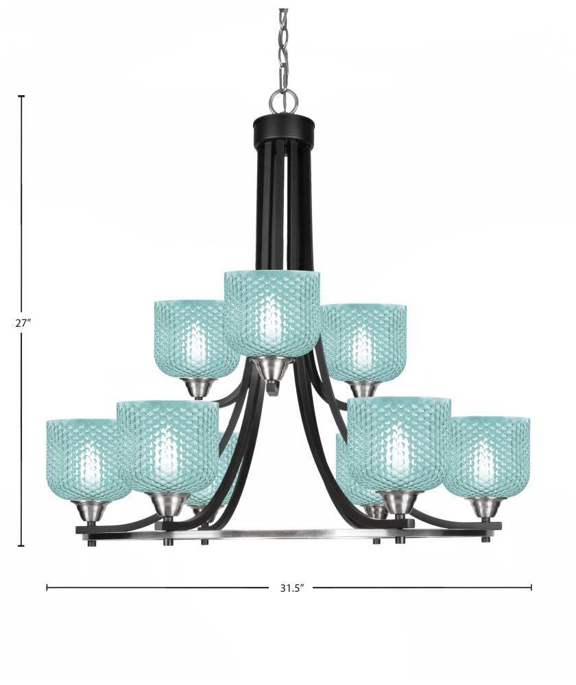 Paramount 9 Light Uplight Chandelier Shown In Matte Black & Brushed Nickel Finish With 6 Turquoise Textured Glass