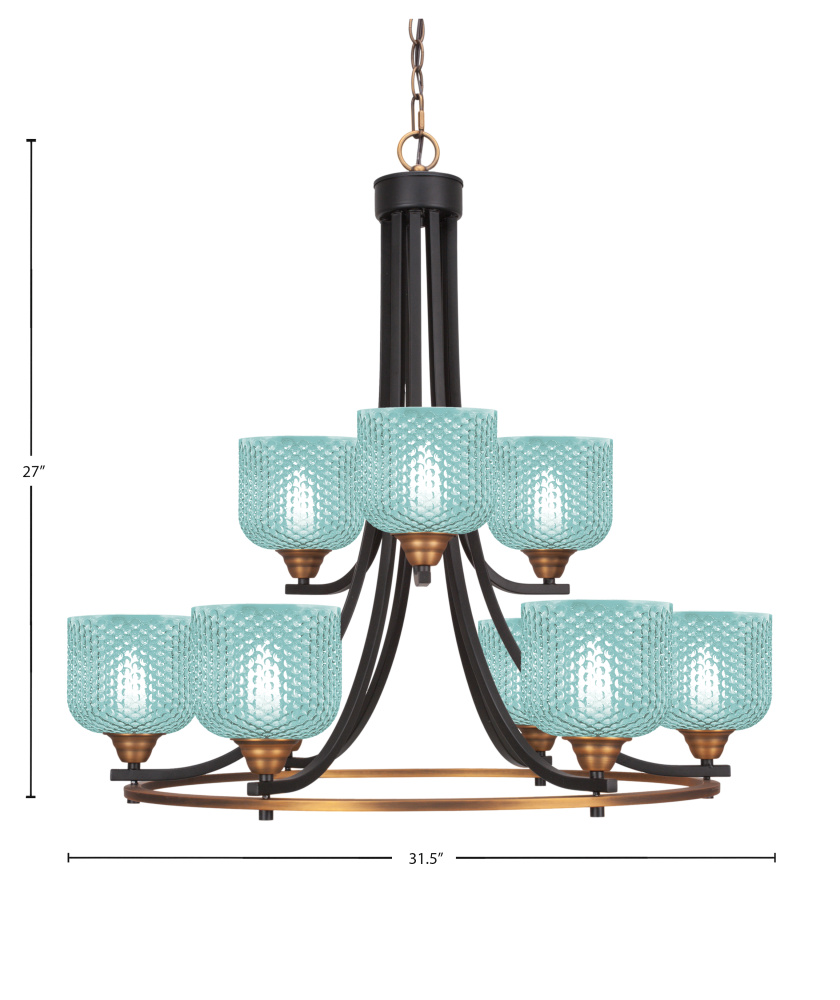 Paramount 9 Light Uplight Chandelier Shown In Matte Black & Brass Finish With 6 Turquoise Textured Glass