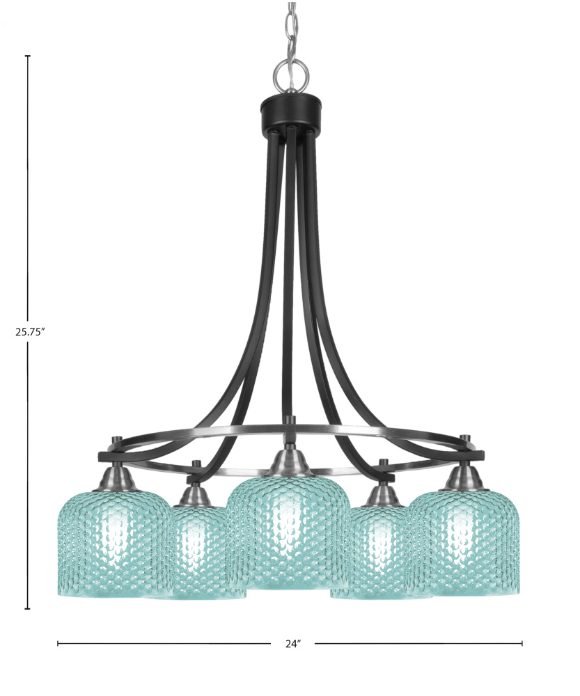 Paramount 5 Light Downlight Chandelier Shown In Matte Black & Brushed Nickel Finish With 6 Turquoise Textured Glass