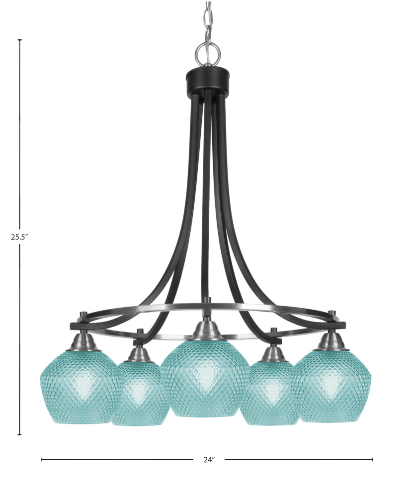 Paramount 5 Light Downlight Chandelier Shown In Matte Black & Brushed Nickel Finish With 6 Turquoise Textured Glass