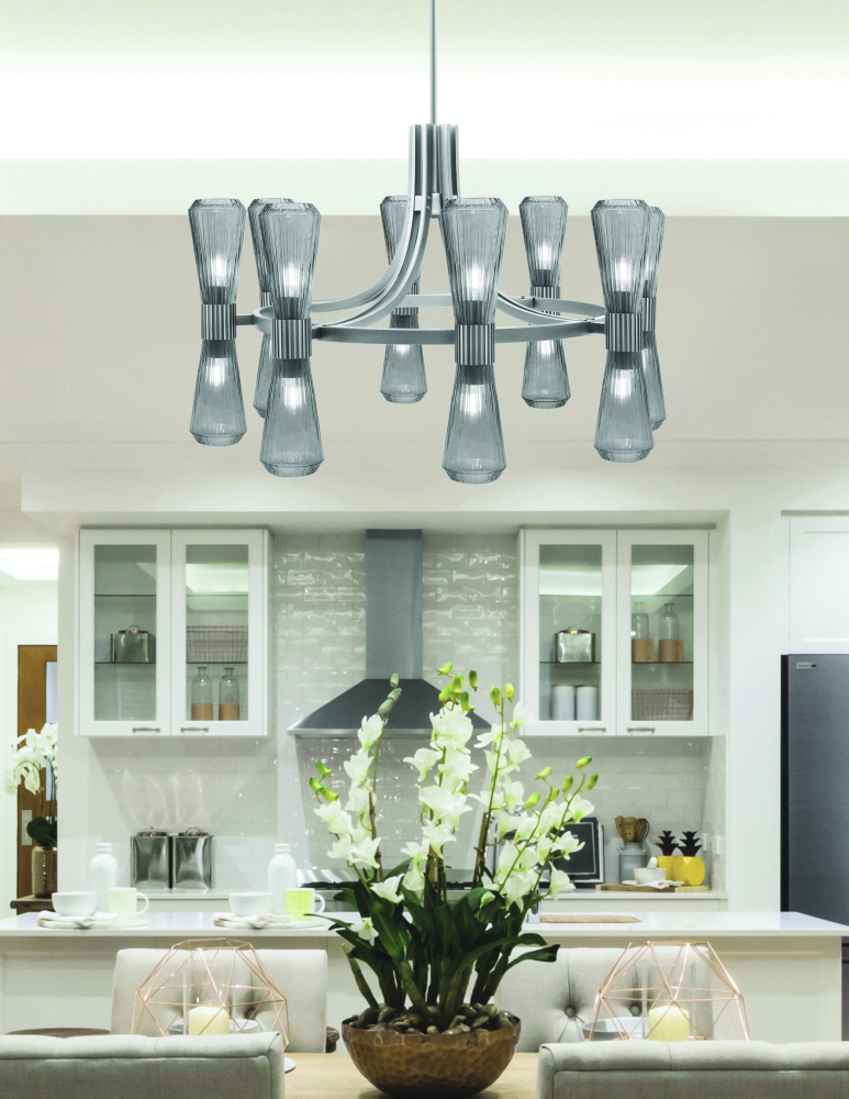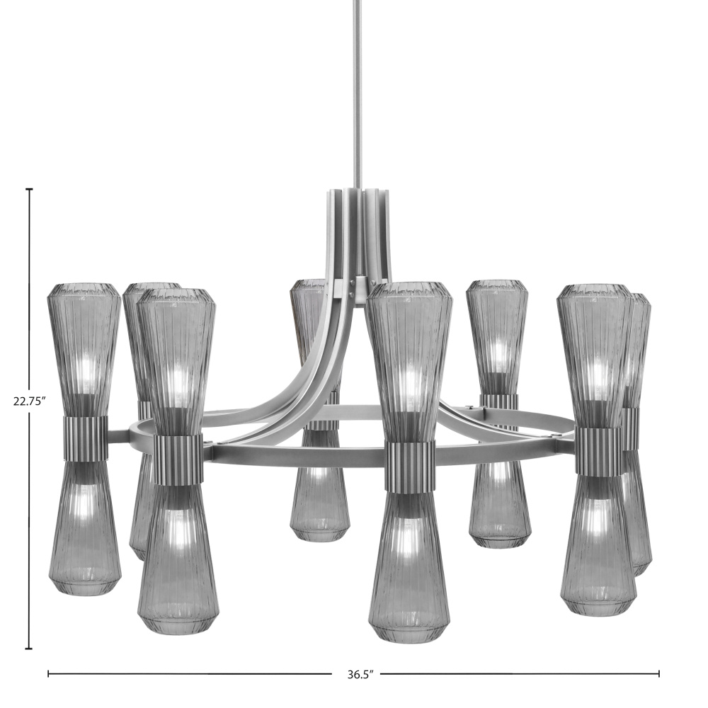 Modern design meets bold sophistication in the Everleigh 16 Light Chandelier. Finished in a deep Graphite tone, this striking fixture features sixteen lights, each paired with a 4? smoke glass shade that casts a warm, ambient glow. The layered, geometric structure adds visual interest and scale.