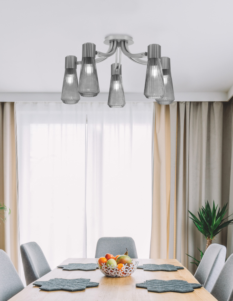 Bold yet refined, the Everleigh 5-Light Semi-Flush fixture pairs modern styling with a touch of vintage character. Its deep graphite finish sets a sleek, contemporary tone, while five 4? smoke ribbed glass shades diffuse light with moody elegance and subtle texture. The ribbed glass adds depth and visual interest, casting a warm, ambient glow that enhances both modern and transitional interiors.