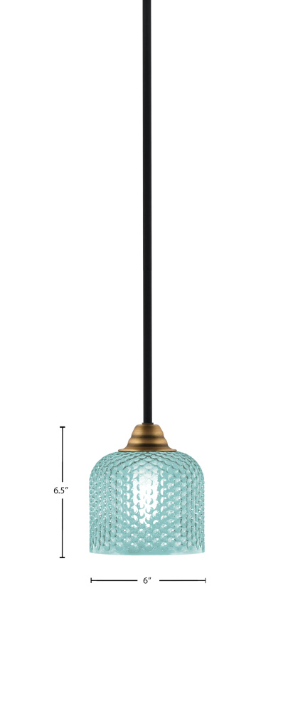 Paramount Stem Hung Mini Pendant Shown In Matte Black & Brass Finish With 6 Turquoise Textured Glass