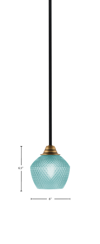 Paramount Stem Hung Mini Pendant Shown In Matte Black & Brass Finish With 6 Turquoise Textured Glass