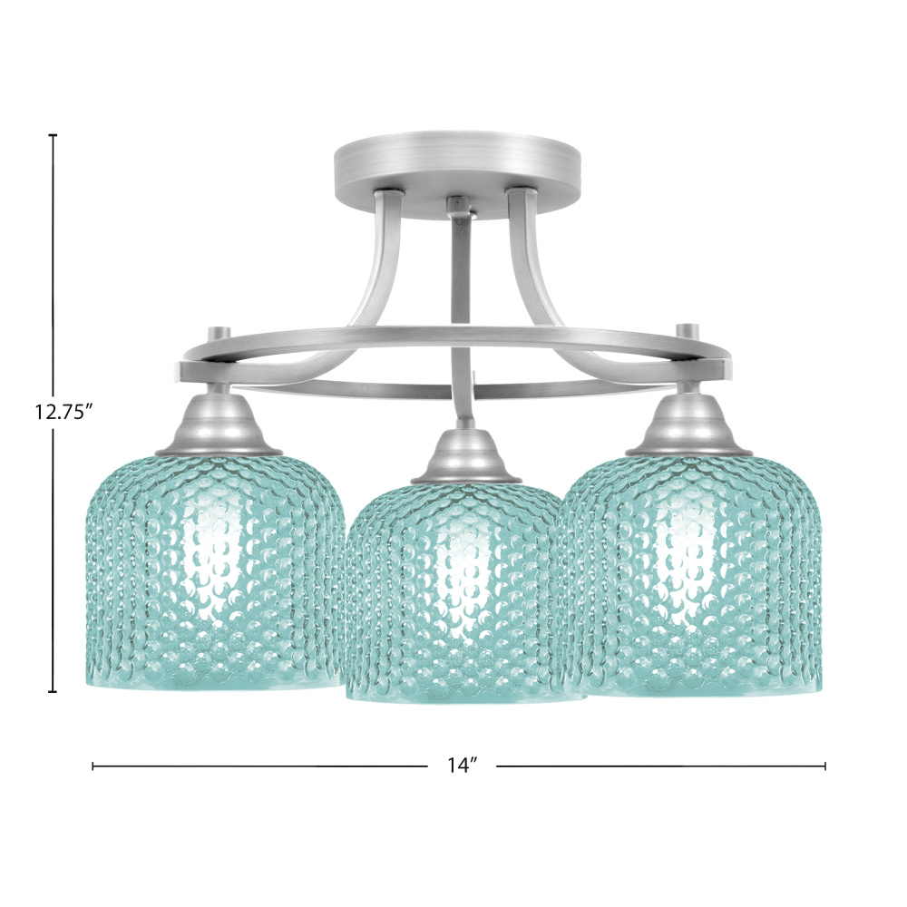 Paramount 3 Light Semi Flush Shown In Brushed Nickel Finish With 6 Turquoise Textured Glass