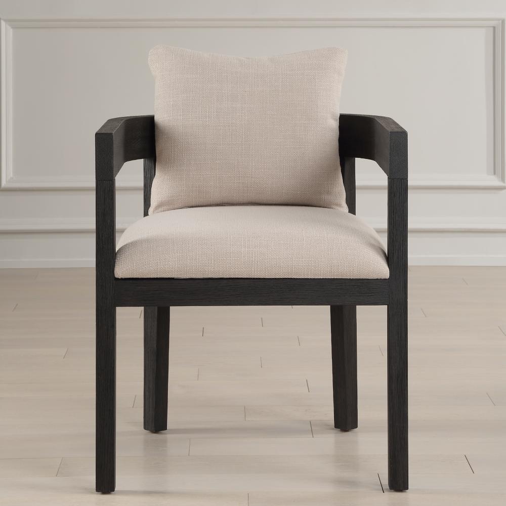 Modern Style Is Elevated By Clean Lines And Classic Finishes In The Balboa Dining Chair. Solidly Constructed From Oak In A Rich Ebony Stain, Paired With A Beige Linen Blend Polyester Fabric. Featuring An Open Back Design With An Added Support Pillow To Ensure That Style Does Not Sacrifice Comfort. Seat Height Is 19".