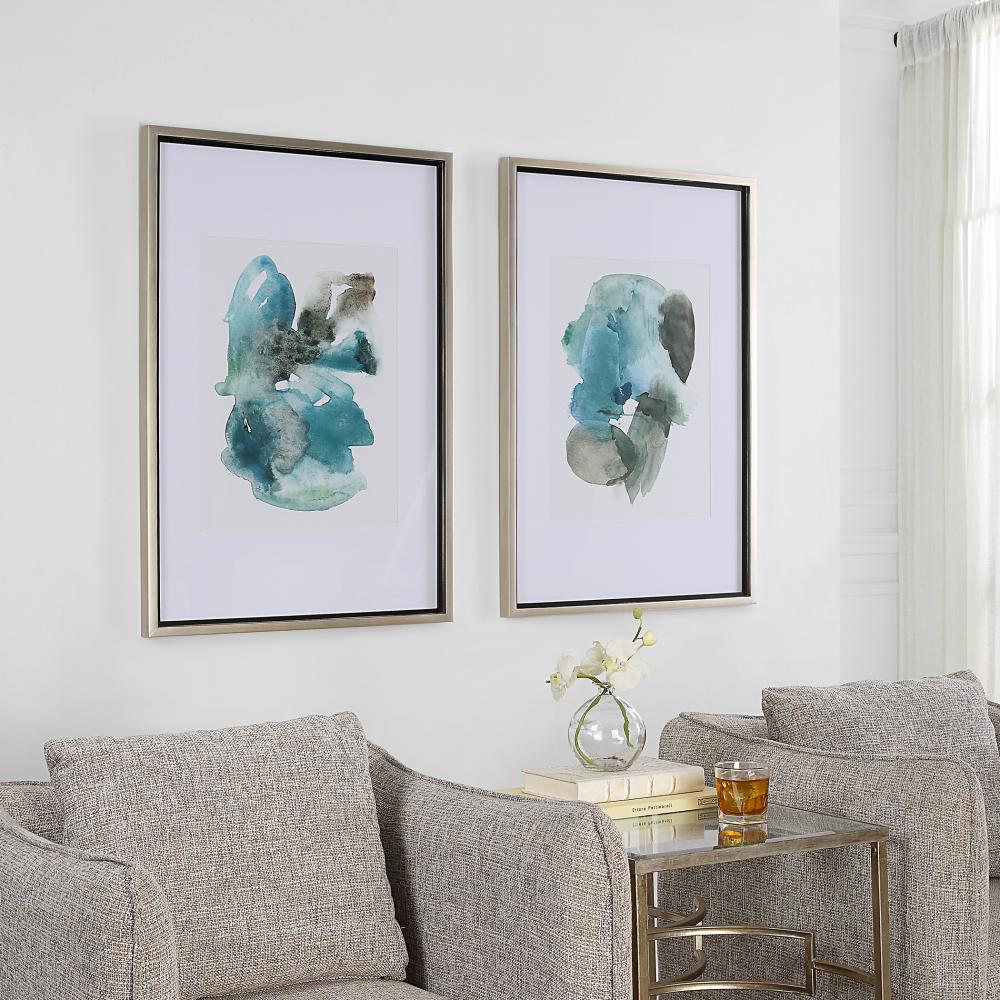 Capturing Remarkable Watercolor Composition, These Framed Prints Feature Abstract Images in Smoke Gray and Turquoise Blue. Each Print is Accented By A Large White Mat, Black Inner Liner, and Champagne Silver Frame. Artwork By Terri Burris.
