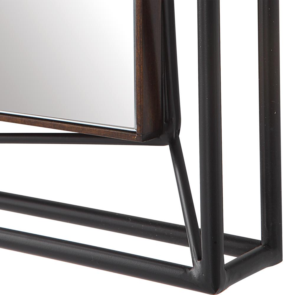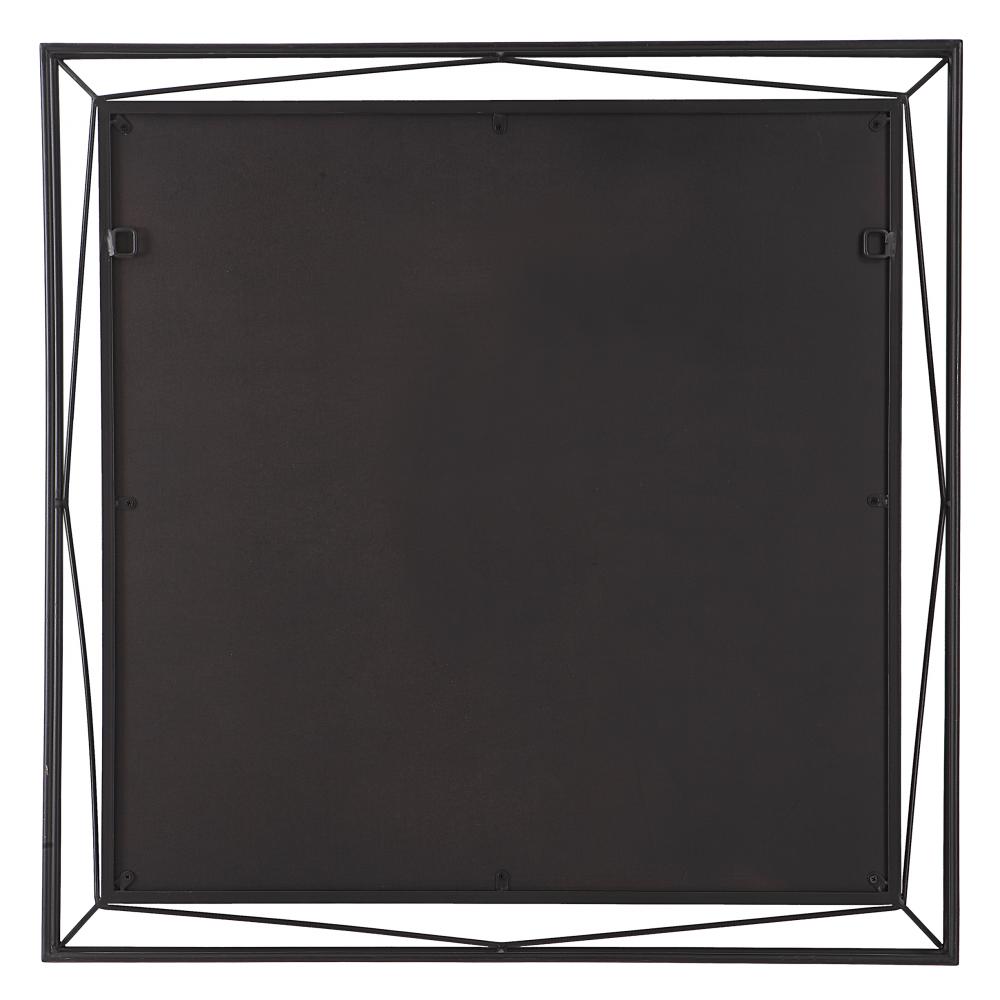 Inspired By Contemporary Designs, This Suspended Square Mirror is Accented By A 3-dimensional Angular Metal Frame in Satin Black with A Petite Pond Cypress Wood Frame Surrounding The Mirror.