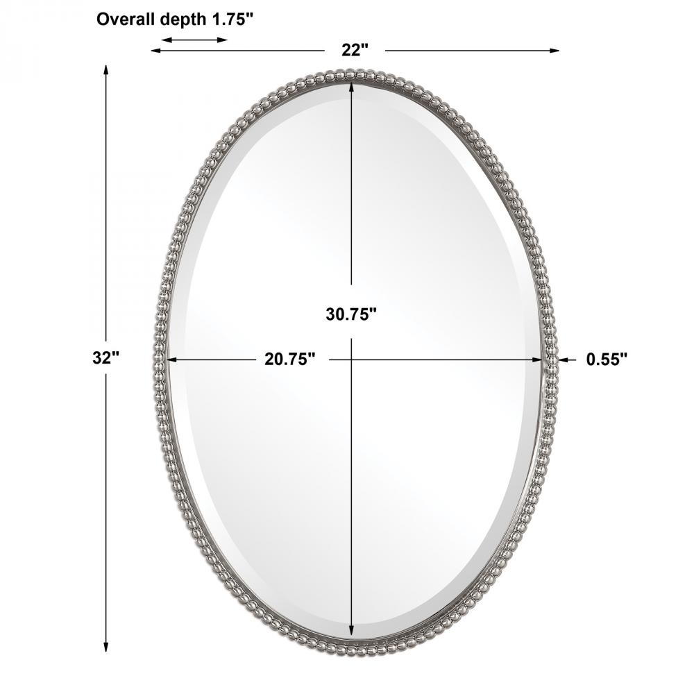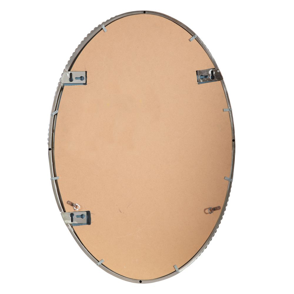 This Oval Mirror Features A Frame Made of Hand Forged Metal with A Brushed Nickel Finish. Mirror is Beveled and May Be Hung Horizontal or Vertical.