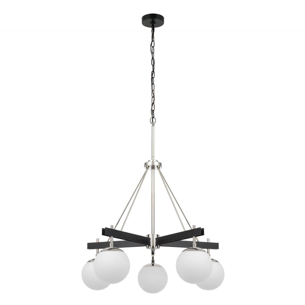 Mid-Century and Post Modern Design Influences. Gorgeous White Recycled Glass Globes. Easy Re-lamping. Two Tone Satin Black with Brass or Polished Nickel with Black Finshes.