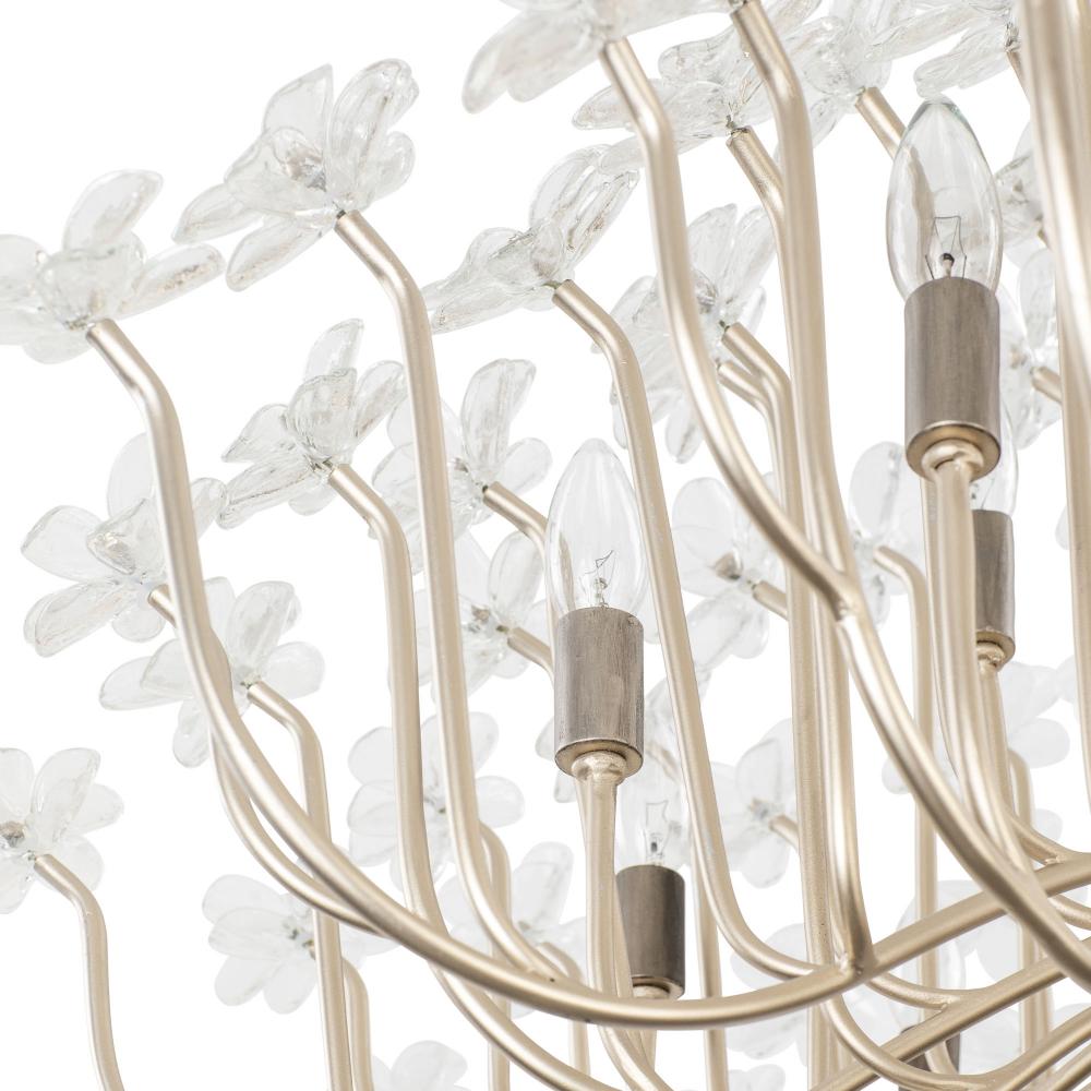 When you first see it aglow with its fine intricacies, it may not show, but the Wildflower collection started its path to existence thanks to Mary V. Walcott's Oconee-Bells discovered in the Smithsonian Libraries and Archives Special Collections. Taking center stage is a touch of Danish modern on top of midcentury. Wildflower combines delicate, handmade ice glass flower petals, with equally delicate wispy hand-forged and recycled steel tubing and metal work. Available in gold or black.