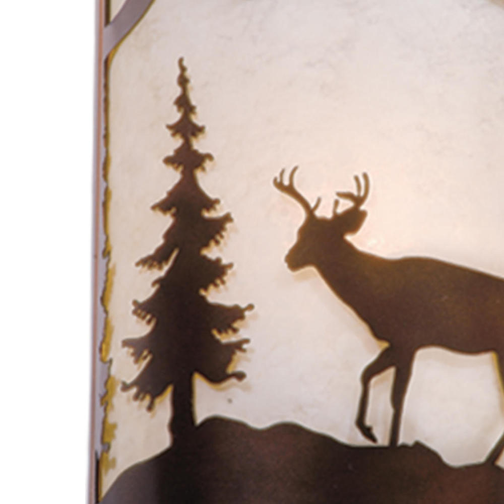 Evoking the spirit of the wilderness, this rustic themed light is clad in a burnished bronze finish and features silhouetted deer imagery atop glowing white tiffany style glass. The classic form of this lamp makes it a great choice for a vacation lodge, cabin or a suburban home - it will complement a variety of home styles: anywhere you want to bring an element of nature. Medium screw base lamping provides maximum light output, and flexibility in bulb choice. This versatile light is outdoor damp rated and can be used indoors as well as outdoors. Mount these lights on your porch, hallway, or entryway and experience this stylish look for yourself.