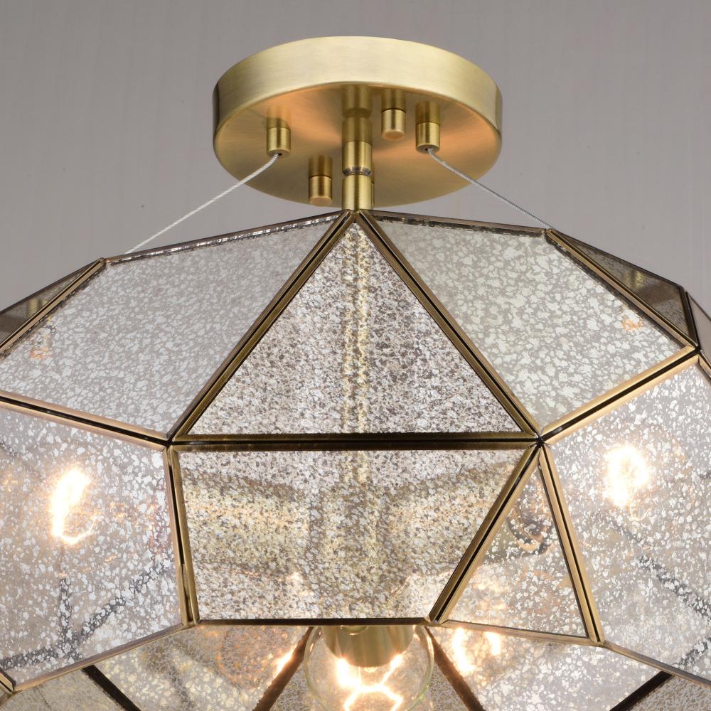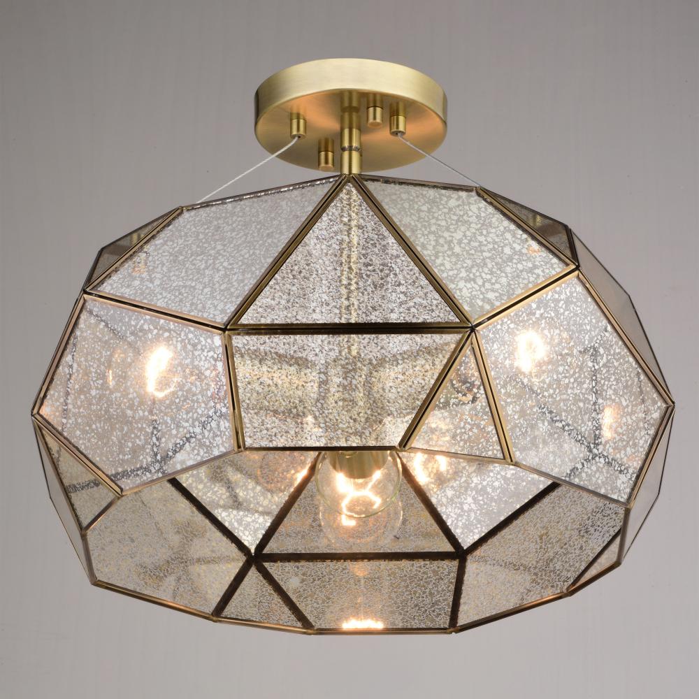 Faceted glass defines the dramatic beauty of the Euclid indoor lighting collection. Gold aged brass finish pairs with asymmetric panels of mercury glass for a perfect contemporary take on a mid-century modern classic. Combine that with vintage Edison style filament bulbs to complete the look. This semi flush mount ceiling light would be a stunning addition to any entryway, bedroom, family room, kitchen, dining area, or foyer.