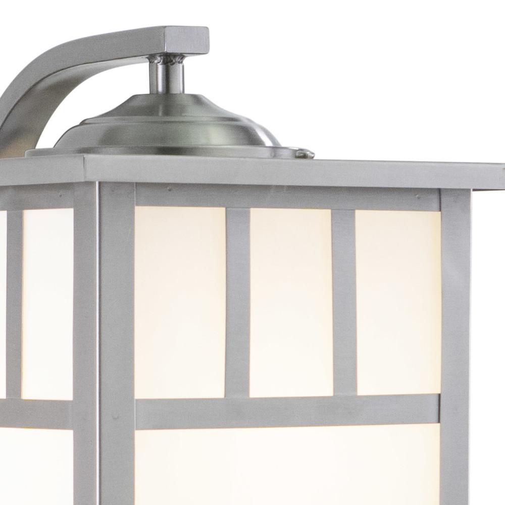 Flat strips of stainless steel outline white tiffany style glass panes in the Mission collection. The simple design of this fixture has a mission style look perfect for Frank Lloyd Wright prairie inspired decors. This outdoor wall light is ideal for your porch, entryway, garage, or any other area of your home.