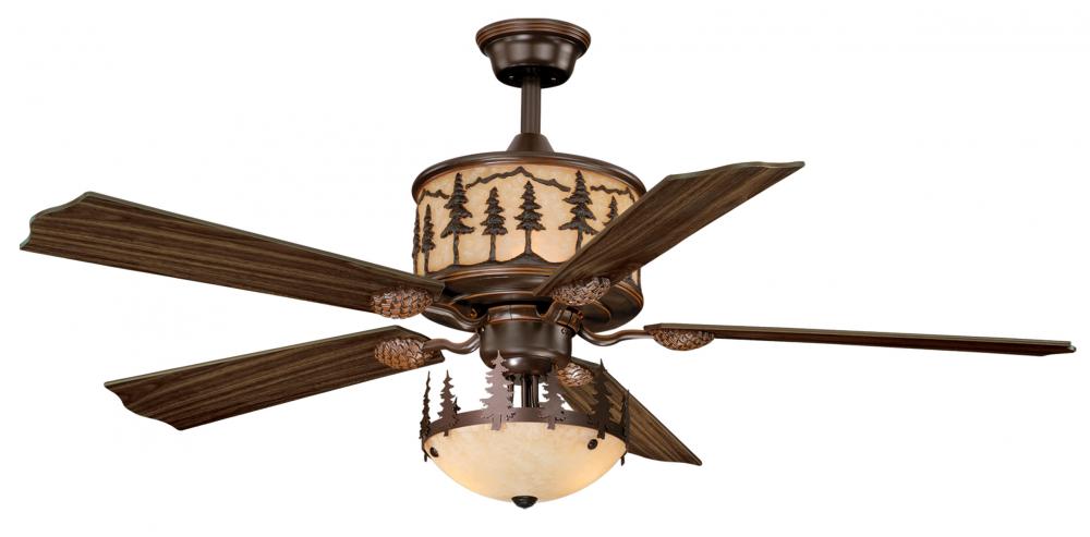Evoking the spirit of the wilderness, this rustic themed ceiling fan is clad in a burnished bronze finish and features silhouetted tree imagery atop glowing amber flake glass. It a great choice for a vacation lodge, cabin or a suburban home - it will complement a variety of home styles: anywhere you want to bring an element of nature. Add a light kit (sold separately) to brighten up your space. This fan is compatible with sloped ceilings and includes a 6 inch down rod (longer down rods sold separately). Remote control included for added convenience. Blades are reversible; choose between rosewood and dark walnut. Unique lighted motor housing with energy saving LED bulbs (included).