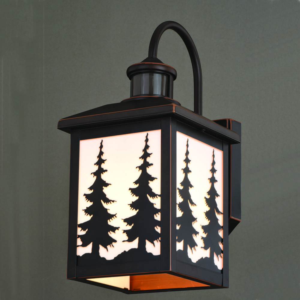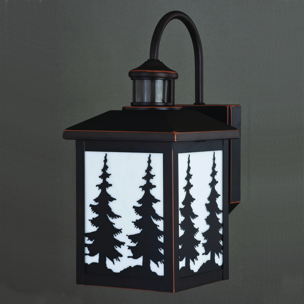Evoking the spirit of the wilderness, this rustic themed light is clad in a burnished bronze finish and features silhouetted tree imagery atop glowing white tiffany style glass. This outdoor wall light is ideal for your porch, entryway, garage, or any other area of your home. Dualux patented dual-level security lighting is outdoor lighting made smarter—brighter light at dusk, dimmer at night, brightening instantly when it detects motion. Designed to reliably and effortlessly enhance your home’s beauty, security and efficiency from dusk to dawn with its built in motion sensor and photocell. This fixture works with any dimmable incandescent or halogen bulb and many dimmable LED bulb models.